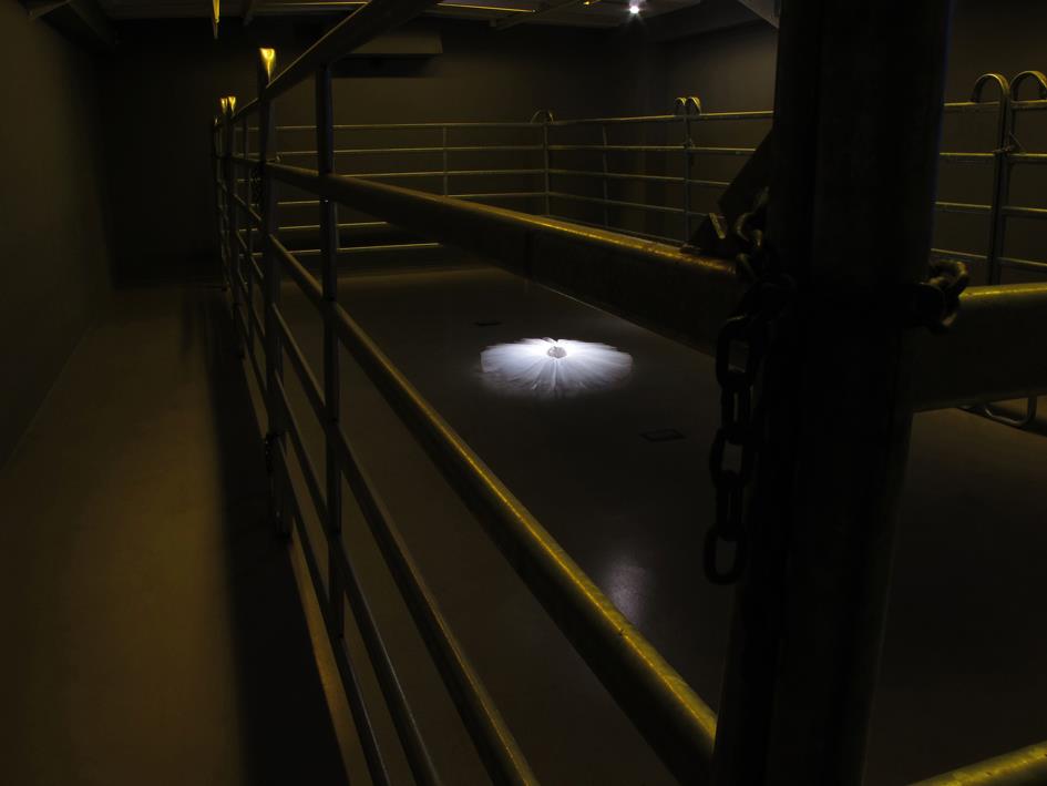 L’exposition est formée de trois salles auxquelles Claude Lévêque a conféré trois ambiances lumineuses et sonores : « Chant » – « Wagon » – « Orotario ». La première salle est éclairée par les échappées lumineuses de l’extérieur et de la seconde salle. Le visiteur pénètre l’obscurité et perçoit des ombres. Au-dessus de lui sont suspendus des parapluies noirs, éclatés, hors d’usage. Telles des chauves-souris endormies et agrippées au plafond dune grotte. Des bruits métalliques s’échappent, des grincements sourds et inquiétants. Au centre de la seconde salle est suspendu à quatre chaînes un plateau de wagon en bois sur laquelle sont disposés des draps blancs qui forment un paysage énigmatique. Au-dessus du plateau qui se balance lentement dans l’espace, une forêt de trente six longs néons ultraviolets (des « chandelles » selon l’artiste), dont la lumière exacerbe la blancheur non seulement du tissu fantomatique, mais aussi les vêtements des visiteurs. La troisième salle est plus éclairée, au centre une cage de contention pour bétail, dans laquelle un tutu de danseuse est abandonné, vide. Le visiteur est contraint à raser les murs pour contourner l’enclos. Un projecteur irradie le tutu, pendant que la musique volontairement éraillée du Lac des Cygnes nous parvient péniblement aux oreilles. « Le mouvement du lac des cygnes de Tchaïkovski complètement distendu et voilé donne le vertige et les rires ridiculisent le drame ».[1] La douceur des souvenirs évoqués par les objets délaissés contraste avec la scénographie troublante. L’artiste installe une rupture et creuse les interstices d’une mémoire collective. Son œuvre est empreinte d’une fragilité et d’une sensibilité qui viennent faire écho à notre propre expérience.