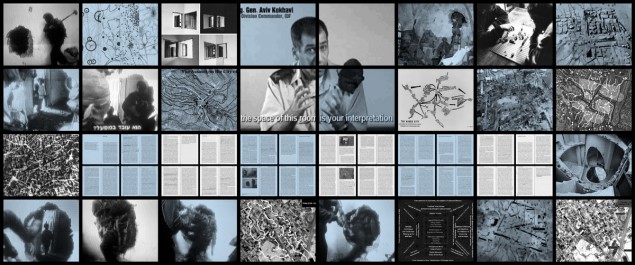 À la topographie s’ajoute la stratégie militaire, que le réalisateur Eyal Weizman (né en 1970, Israël) et le photographe Luc Delahaye (né en 1962, France) analysent dans The Space of This Room is Your Interpretation (2011). Une impressionnante œuvre murale qui mêle texte, photographie et vidéo. Un travail basé sur l’essai À travers les Murs d’Eyal Weizman paru en 2008, qui décrit les techniques et stratégies mises au point par l’armée israélienne et expérimentées en Palestine. Une infiltration quasi invisible des soldats est permise grâce au passage de maisons en maison, qui s’introduisent à travers les murs et les planchers des demeures palestiniennes. Il s’agit d’une stratégie intrusive, violant l’intimité des maisons et de leurs habitants qui ne sont aucunement pris en compte. « La transgression des frontières domestiques par l’armée représente la manifestation même de la répression d’État, la brèche ouverte dans le mur, l’incarnation physique de concept d’état d’exception » (Weizman).