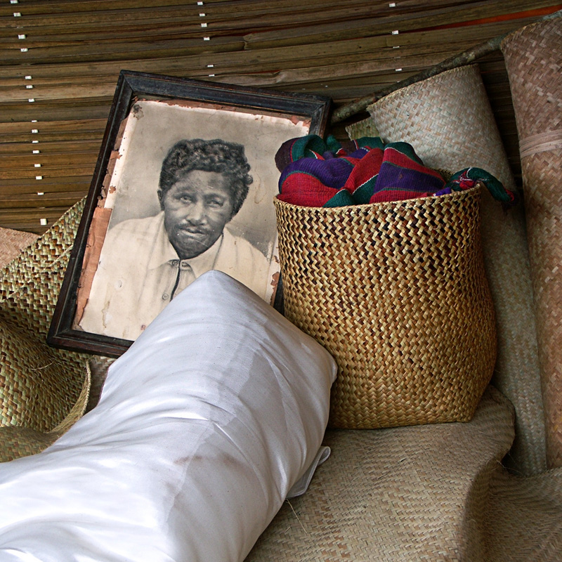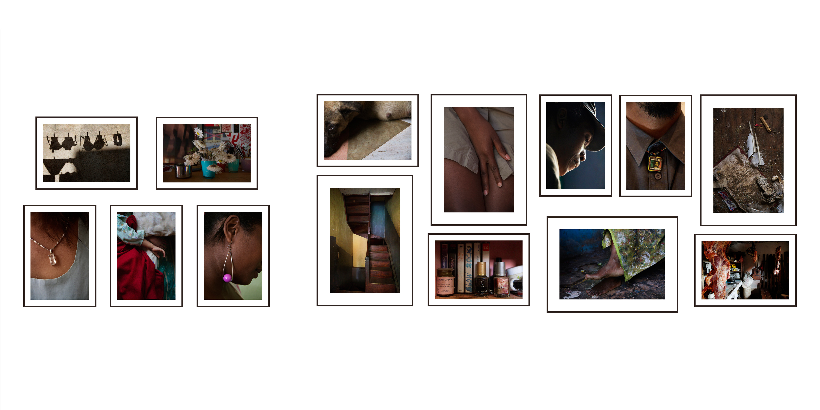 La série est composée de deux volets de photographies couleur, le premier faisant état des intérieurs des familles rencontrées. Des images qui dévoilent « l’atmosphère secrète des intérieurs malgaches contemporains, de toutes classes sans les extrêmes ».[4] Lingerie étendue, bijoux, décorations, animaux domestiques, cuisines et autres objets personnels y sont présentés avec élégance et subtilité. Nous sommes bien loin des images cartes postales présentant l’île comme un paradis où il y fait toujours bon y vivre. Si le premier volet de la série se concentre sur l’environnement, les objets et les atmosphères intérieures des familles, le second volet est lui, consacré à leurs corps, emprunt d’une pudeur préservée par l’artiste. Les corps sont fragmentés, partiellement entrevus. La présence textile, rideaux, vêtements, draps, dissimule les sobres présences. Un second niveau de lecture de la sphère privée qui nous permet de nous rapprocher « davantage de l’espace corporel, cette autre intimité capable de communiquer bien plus facilement qu’à travers la parole, dans un pays où finalement tout le monde se méfie les uns des autres ».[5] Ny Any Aminay est un regard délicat, respectueux et sensible sur une intimité apprivoisée.