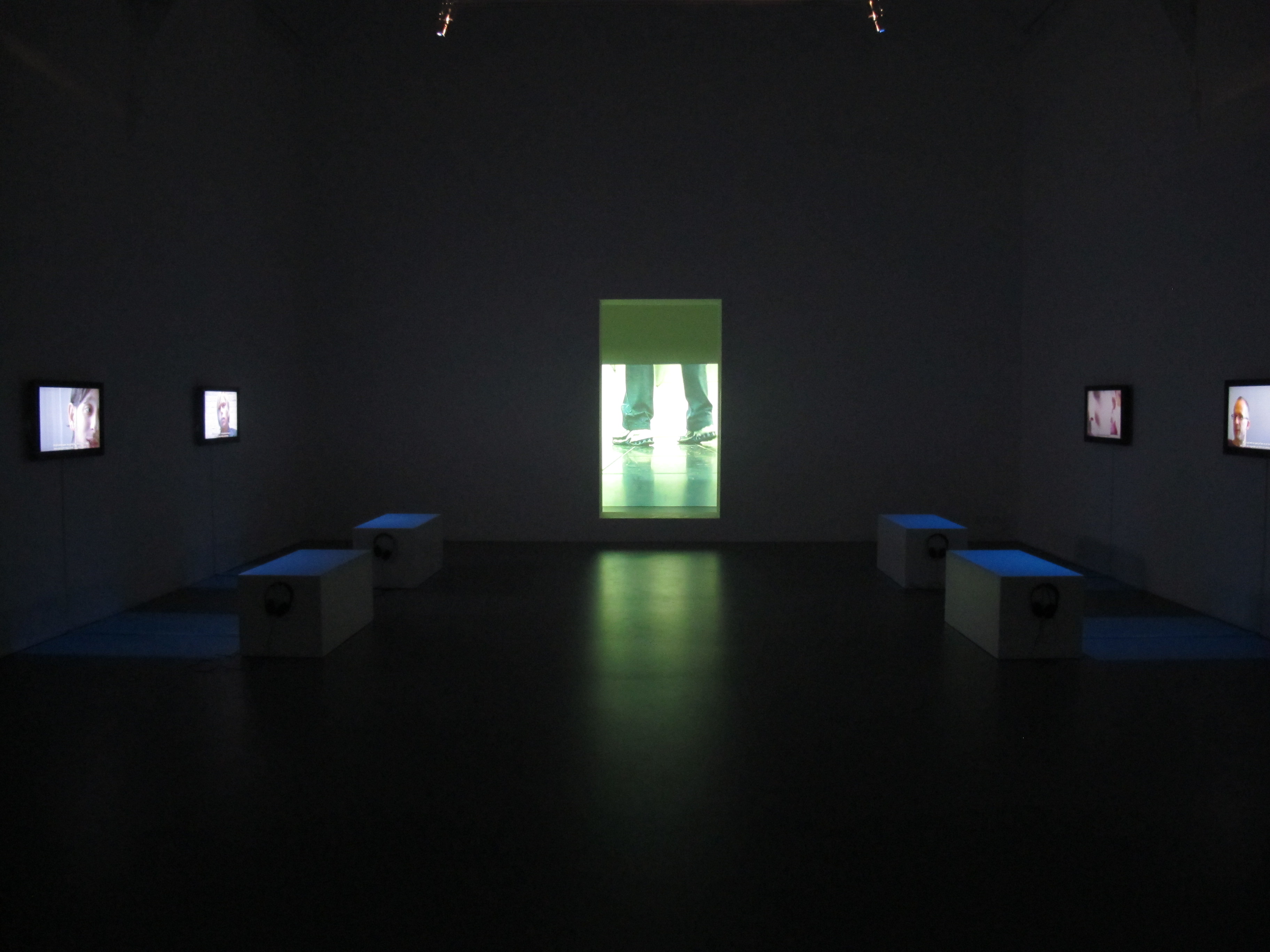 De part et d’autre des huit moniteurs, sont projetés deux films liés à la ville de New York. NYX, Fall (2009) est composé de plans multiples de la ville, des ponts, des trottoirs, d’objets et de travailleurs. Le titre de l’exposition vient d’ailleurs des panneaux de signalisation qu’il a rencontrés lors de ses promenades dans la ville. Il juxtapose ces injonctions publiques aux parcours des escorts. Thierry Micouin a choisi d’entrecouper ces vues urbaines au quotidien des escorts : corps, accessoires, visages en surimpressions, masqués. On y décèle une furtive chorégraphie dans les rues de New York avec David, l’un des escorts interviewé. Le second film, Golden Shoes, est un plan fixe sur les pieds d’hommes dans des toilettes publiques à New York. Face à l’écran, nous nous retrouvons dans une position de voyeur frustrés. Si nous ne voyons rien à partir des pieds masculins, la bande sonore nous indique leurs déambulations mécaniques des toilettes, vers les robinets et le sèche-main. Le voyeurisme est suggéré, il fait appel à un imaginaire collectif et à nos expériences.