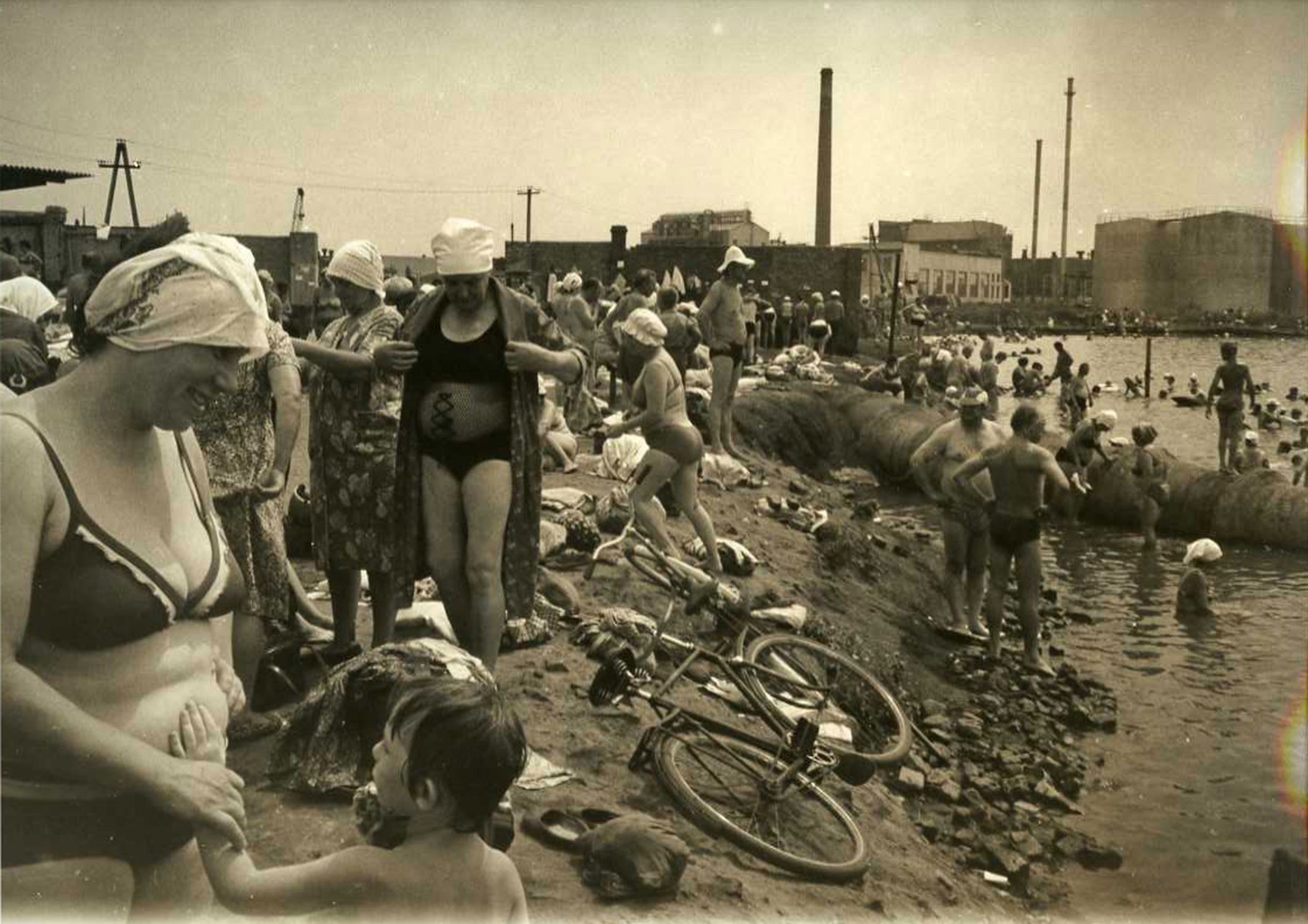 Il entame alors plusieurs séries de reportages qui donnent un visage à un pays réprimé. Salt Lake (1986) est le fruit d’une expédition de Boris Mikhailov sur les rives d’un lac près de Slavansk dans le sud de l’Ukraine, un lieu que fréquentait son père dans les années 1920. Celui-ci lui avait parlé de gens qui se baignaient dans ce lac dont l’eau était considérée comme bénéfique pour la peau et la santé. En 1986, il passe une journée près et dans le lac. À sa plus grande surprise, soixante années plus tard, les baigneurs sont au rendez-vous : ils se prélassent, bronzent et s’exposent sans pudeur dans une eau et des boues dont ils louent les vertus thérapeutiques et bienfaisantes. Pourtant cette eau, chaude et salée, est extrêmement dangereuse, puisqu’elle est rejetée par une usine de soude. Une eau usée, toxique et bouillonnante dans laquelle des familles entières se détendent joyeusement. Le lac, qui dans les années 1920 était vierge de toute activité industrielle, est aujourd’hui encerclé de tuyaux, de cheminées, de briques et de bâtiments, témoins de la grandeur industrielle ukrainienne sous l’ère soviétique. Le photographe s’est immiscé, de manière totalement clandestine (comme pour tout son travail avant les années 1990), dans ces étranges scènes, capturant ainsi des images des corps en maillots, dénudés, insouciants, des visages souriants, mêlés aux paysages mécanisés, deshumanisants et toxiques. Cinquante photographies sépia, retraçant des scènes surréalistes, où des individus, apparemment indifférents aux méfaits de leur environnement, profitent d’une liberté et d’un bien être immédiats, éphémères.