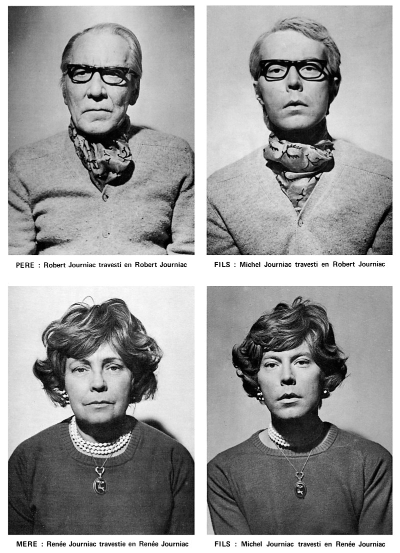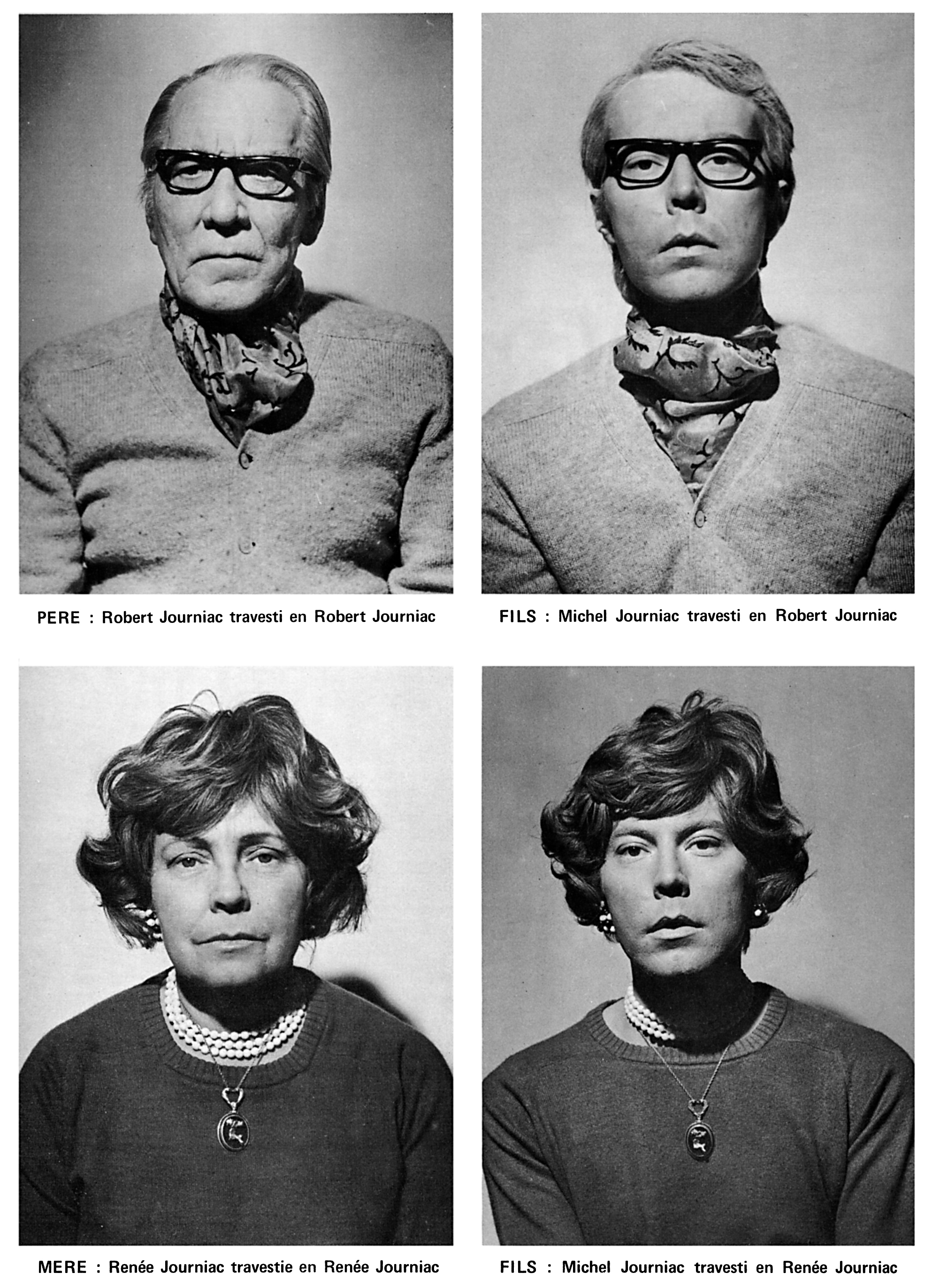 De manière plus trouble, il travaille sur sa relation avec ses parents par le biais du complexe d’œdipe développé par Sigmund Freud. Aimer la mère et tuer le père. Ainsi il produit Hommage à Freud (1972), où il se métamorphose en son propre père et en sa propre mère. La juxtaposition des quatre portraits en noir et blanc est fascinante. Le complexe d’Œdipe est également mis en œuvre par Journiac avec une installation comme Oedipus Rex (1984) où trois squelettes sont mis en scène. L’un est assis sur une chaise, il s’agit de l’artiste lui-même, un autre est pendu par les pieds, recouverts de tissus, le père, le dernier les allongé au sol, nu, la mère. Le fils semble épris de remords après avoir tué son père et couché avec sa mère. Avec la série L’inceste (1975), il monte un mini scénario avec son père, sa mère et lui-même. Trois protagonistes pour une trouble histoire : père-amant, fils-voyeur, fils-fille-amante, fils-garçon-amant et mère-amant. Neuf photomontages à travers lesquels il expérimente les possibilités de représentations et d’incarnations de l’Œdipe.
