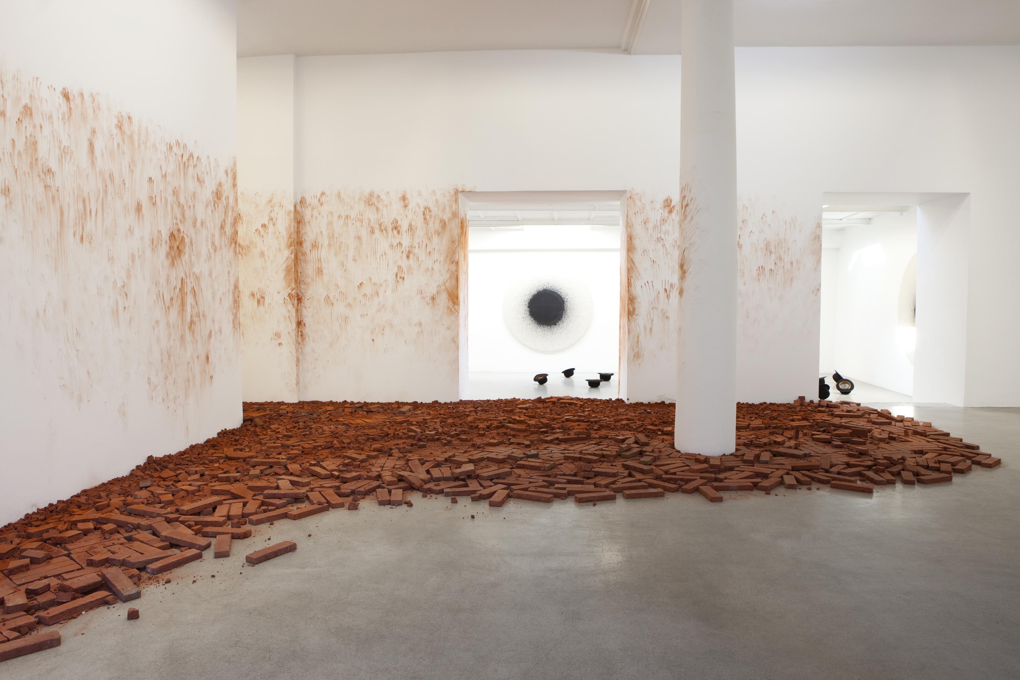 Latifa Echakhch - Tkaf, 2011 Installation in situ : Briques et pigment. Dimensions variables. - Mer d'encre, 2012 Installation au sol. Chapeaux melon, résine et encre. Dimensions variables - Tambour 36' & Tambour 93', 2012 Encre indienne noire sur toiles. 173 cm de diamètre Vue de l'exposition "Tkaf", kamel mennour, Paris, 2012 © Latifa Echakhch Photo. Fabrice Seixas Courtesy the artist and kamel mennour, Paris