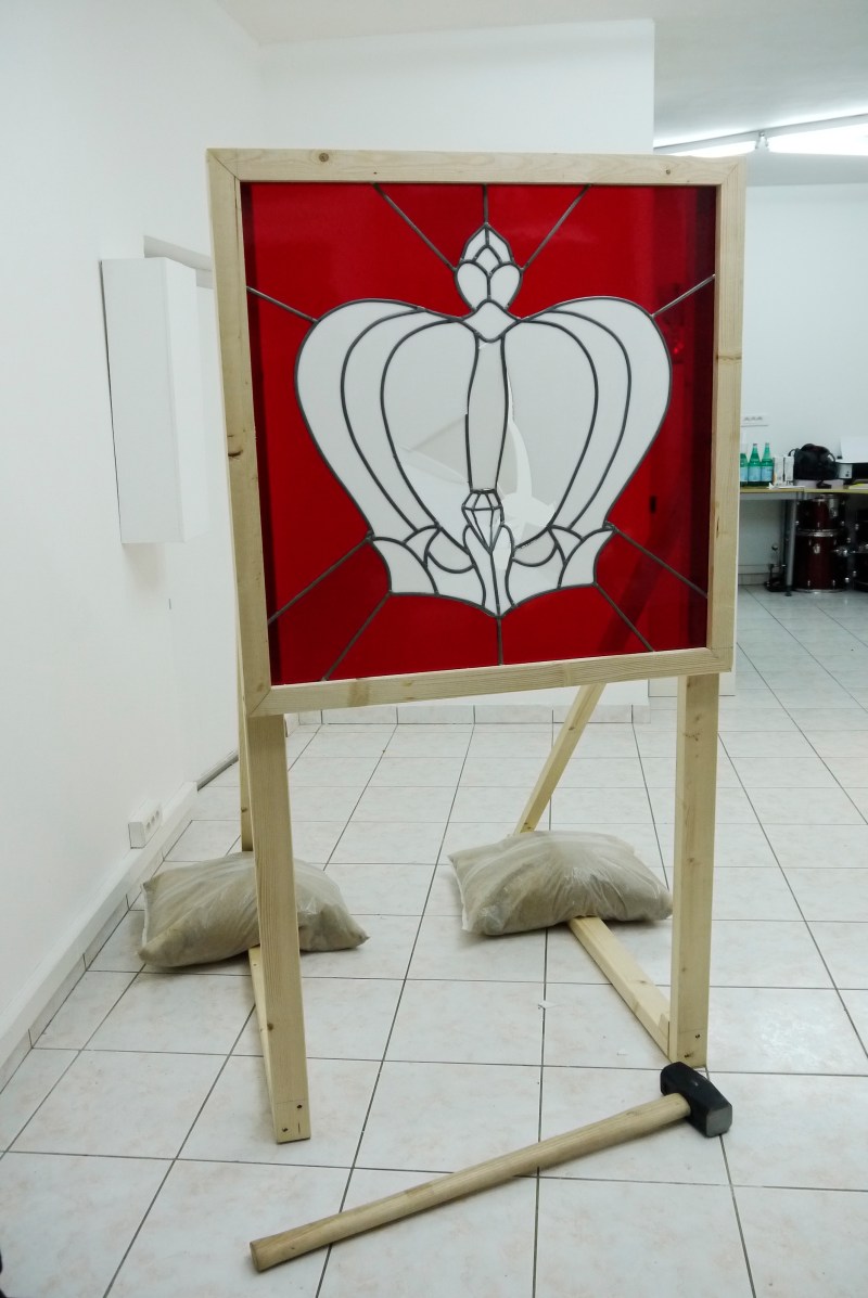 La seconde œuvre, Présidentielle, est plus provocante, piquante et radicale. En plein cœur d’une campagne électorale agitée, dure et virulente par la pauvreté des débats proposés, le vitrail représente une couronne stylisée. Celle du roi déchu ou du roi à venir. Elle peut être celle de Nicolas Sarkozy, l’hyperprésident qui pendant cinq ans a démontré une omniprésence et des comportements dignes d’un néo-monarque. De manière symbolique, l’artiste a, le soir du vernissage, donné un coup de massue au centre de l’œuvre. Briser pour en finir avec les discours trompeurs, avec cette spirale du toujours plus où finalement les citoyens en pâtissent continuellement. Briser pour en finir avec les petits rois de pacotilles et pour revenir à des sujets essentiels. L’œuvre reprend l’esprit des images de propagande en utilisant une iconographie claire, qui est ici accompagnée d’un geste radical renvoyant à l’esprit critique et ironique de l’artiste.