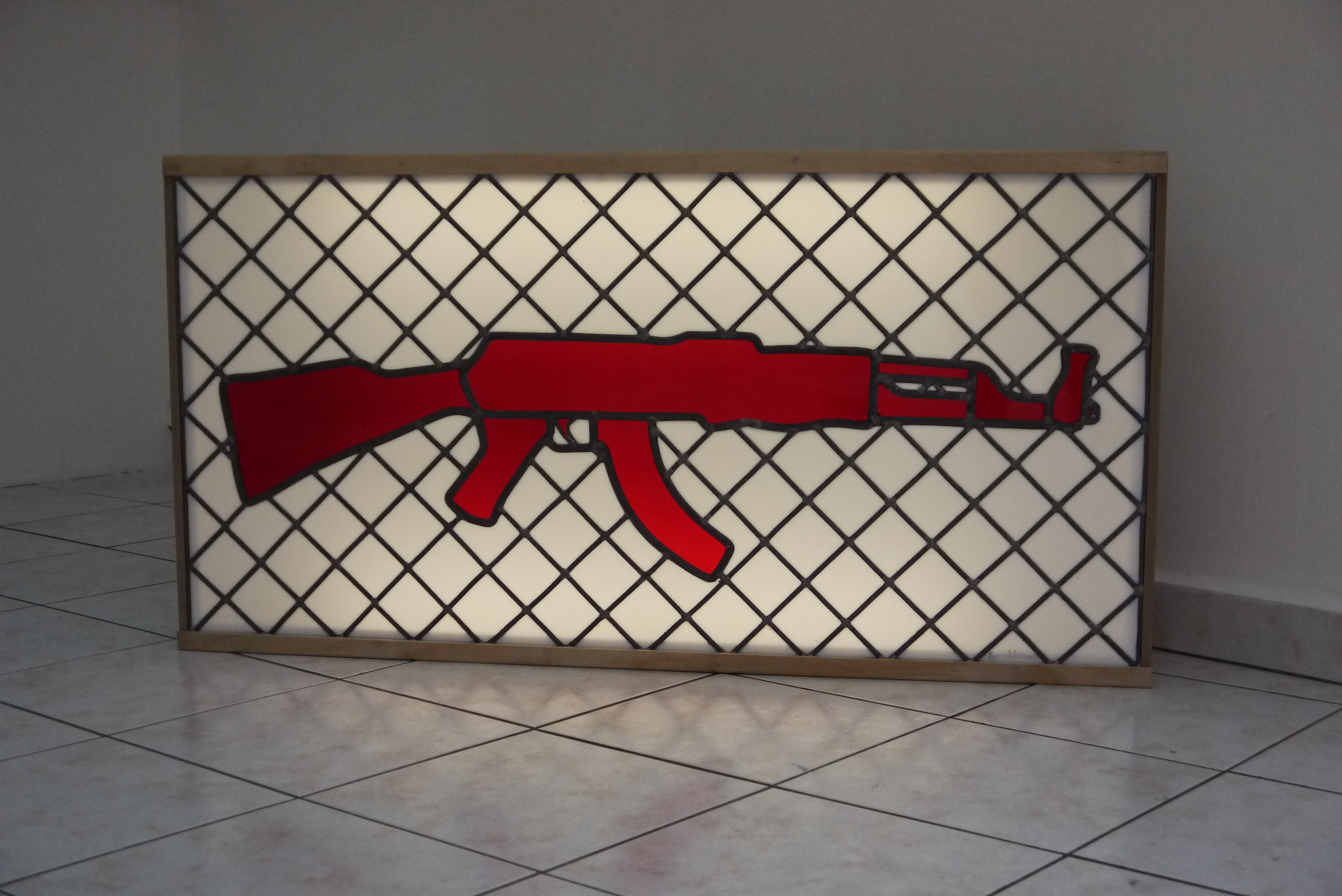 Mitraillette, 2012 Caisson lumineux en bois, vitrail Dimensions : 120 x 60 x 15 cm © Photos : Mélanie Lecointe