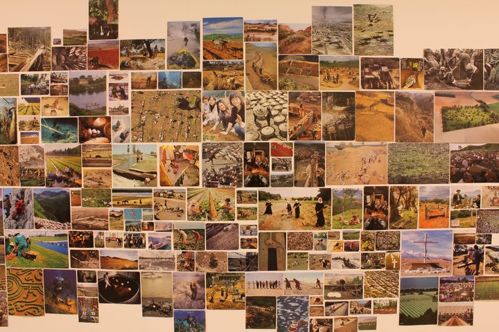 L’exposition marseillaise présente, entre autres, trois œuvres produites à partir d’une archéologie personnelle des sols. Via la photographie, la vidéo et la sculpture, Régis Perray compile et classe ses collections d’images, de traces et de signes. Le Mur des Sols (1995-2012) est le fruit d’années de recherches iconographiques, durant lesquelles il a rassemblé des cartes postales, des images de presse et des cartes topographiques. Des documents en lien avec les sols du monde, classifiés en plusieurs groupes : engin, travail, guerre, sport, cimetières, sacrés etc. Mis bout-à-bout, les groupes constituent un ensemble qui mesure aujourd’hui plus de 40 mètres. À Marseille, sont présentés 14 mètres d’images, accrochés de manière à ce que chaque visiteur puisse embrasser tous les visuels. Une accessibilité qui permet une prise en compte individuelle de chaque document par tous. Le Mur des Sols est une cartographie évolutive, mentale et concrète qui synthétise les recherches de l’artiste. La mémoire des lieux est bien au cœur de son projet artistique.