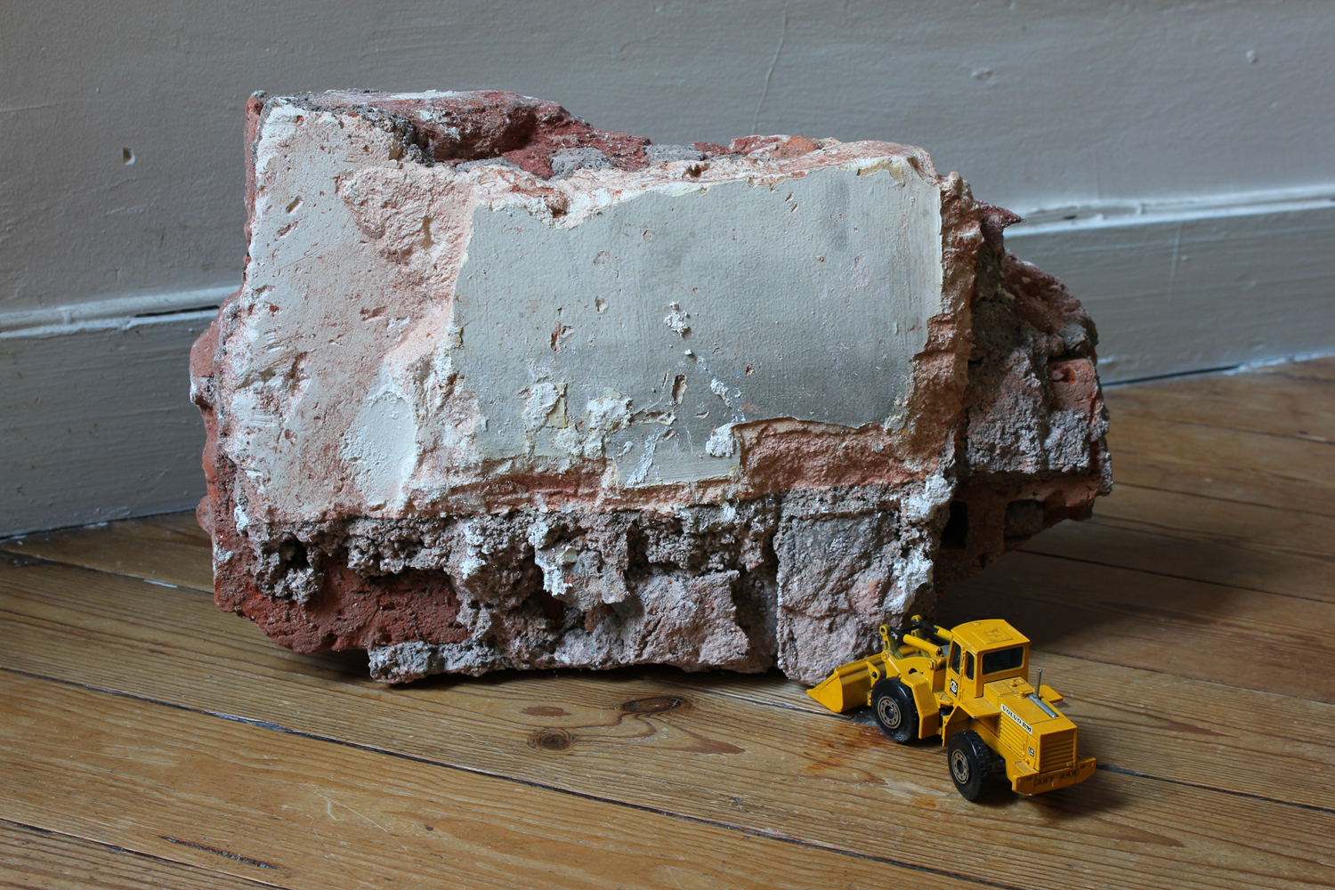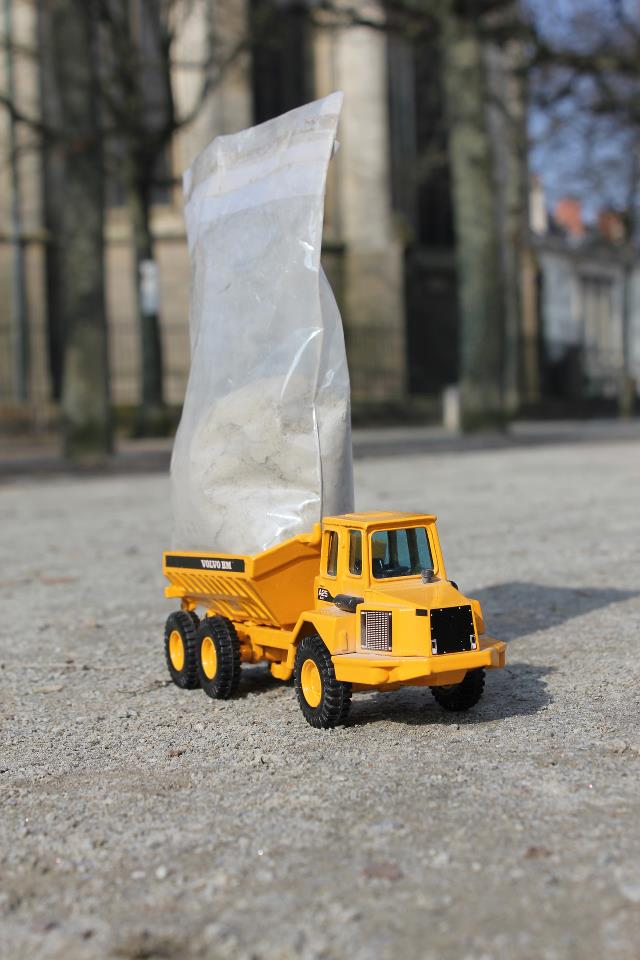Cette recherche au fil de ses balades urbaines s’accompagne d’une attention particulière aux engins présents sur les chantiers, de construction, de destruction ou de rénovation. Fasciné par ces machines qu’il n’est pas autorisé à conduire, Régis Perray collectionne des engins miniatures. Des reproductions fidèles de tractopelles, de dumper, de tracteur ou de rouleaux-compresseurs qu’il met en relation avec des matériaux extraits de ses propres chantiers antérieurs. Ainsi, nous rencontrons un Autoportrait au Pavé Tête de Mort (2011) et nous comprenons que ce dialogue entre l’engin et la matière incarne l’artiste lui-même. Plus récemment, en mars 2012, il a mis en œuvre un travail de correspondance avec celui de Michael Heizer, figure historique du Land Art américain. Ce dernier a entrepris le déplacement pharaonique d’un rocher de 340 tonnes vers le LACMA, le plus grand musée de tout l’Ouest américain. Régis Perray a répondu à l’invitation de l’Observatoire du Land Art qui lui a proposé d’imaginer un dialogue entre cet acheminement colossal et son propre travail.[1] Il imagine 340 grammes déplacés… During Levitated Mass by Michael Heizer, où pendant dix jours (le temps du convoi), il a déplacé un Dumper Volvo miniature dans la ville de Nantes. Le petit engin transportait un sachet qui contenait de la poussière récoltée sur la voute de la cathédrale de Chartres quelques mois plus tôt. Au lourd rocher, il a préféré la poussière céleste. Dix jours, dix photographies-constats qui ont permis de donner une modeste portée à l’évènement outre-Atlantique dont le relai médiatique fut maigre. L’artiste s’impose pour chacune de ses interventions et chacun de ses dispositifs, une échelle qui soit toujours liée à son propre corps, sans moyens extenseurs. Le plus simplement possible, son corps va a la rencontre des lieux dont il extrait du sens. Ici, les trois villes de Chartres, Nantes et Los Angeles sont subtilement conjuguées au travers d’une activité poétique et amusante qui vient rendre hommage à l’œuvre d’un artiste qui a influé indirectement sur sa propre démarche.