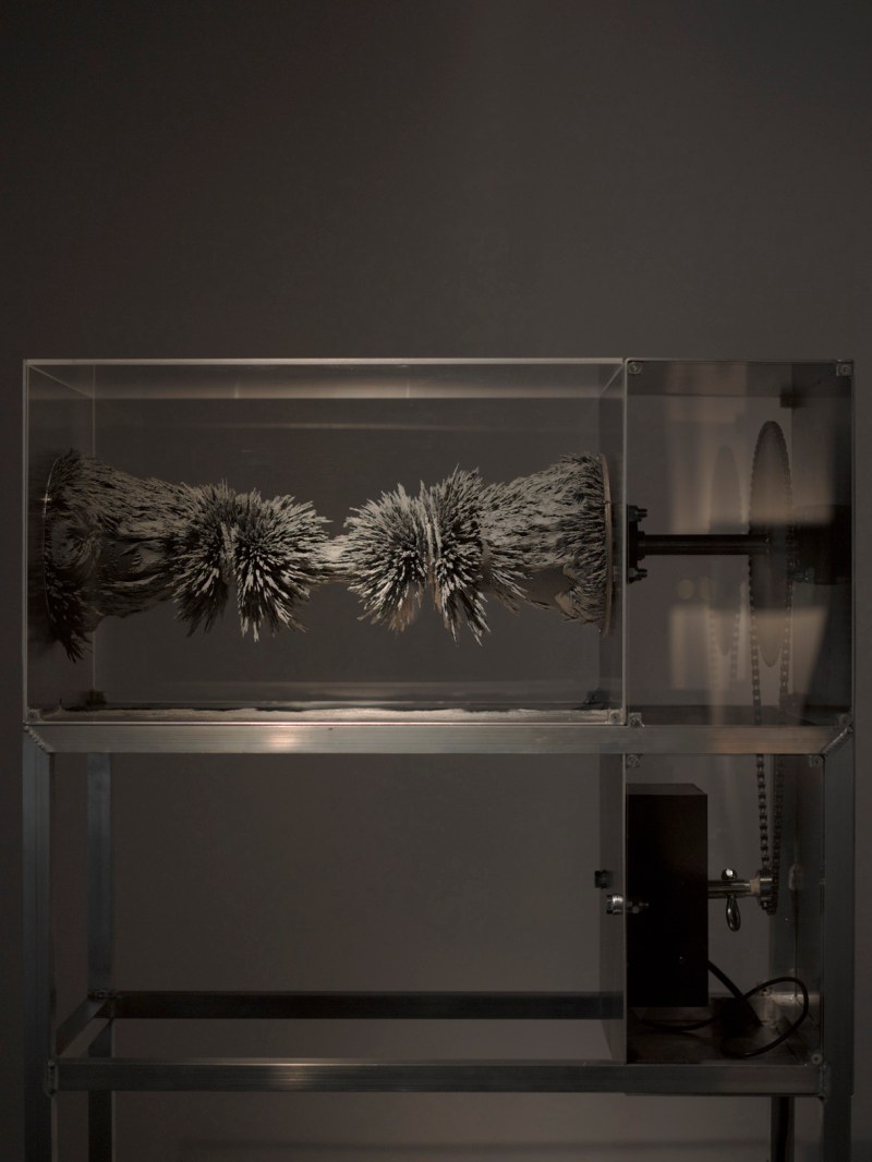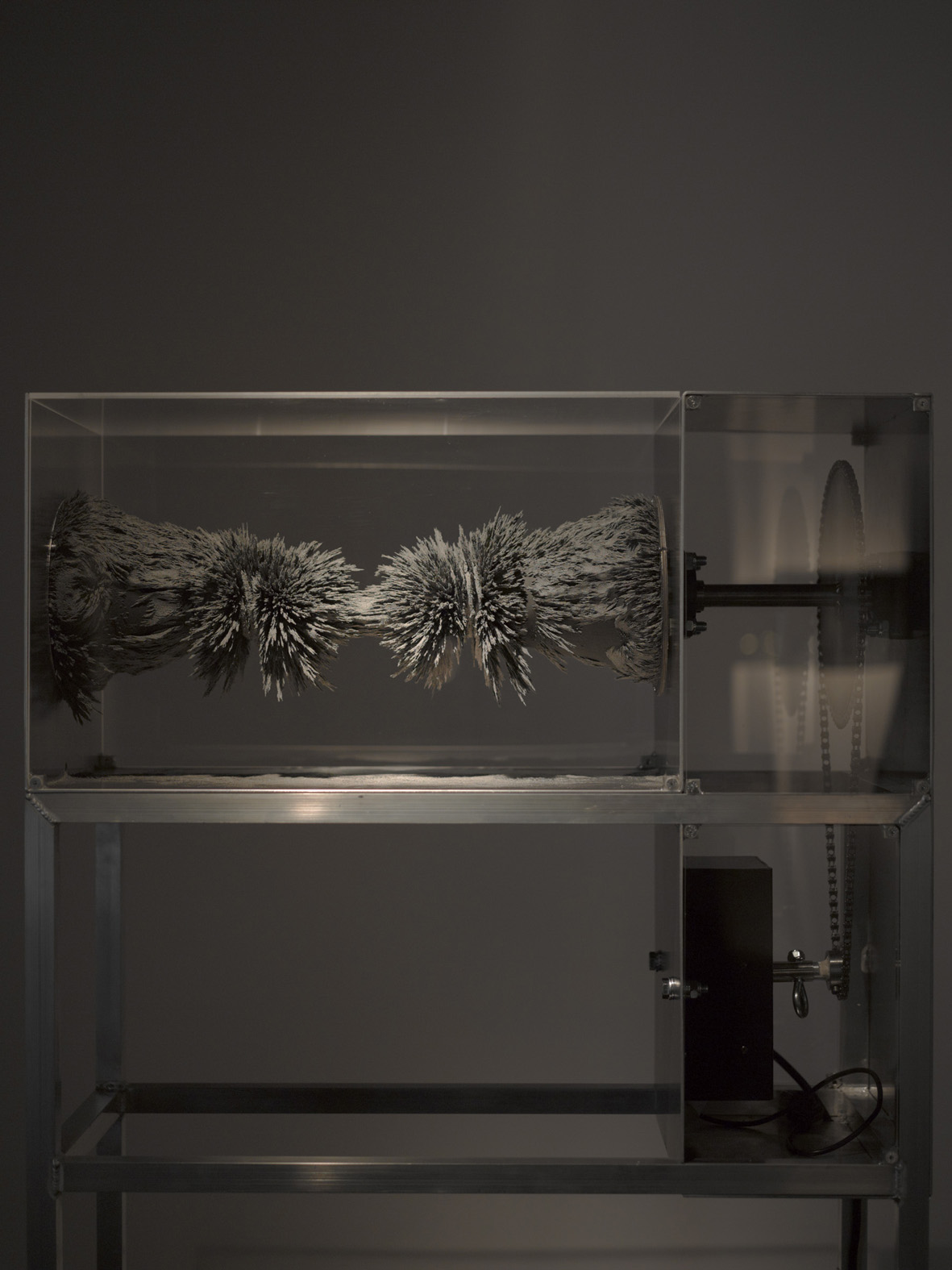 Au rez-de-chaussée, nous sommes d’abord accueillis par Resonarium (2011), une pièce installée dans la vitrine de la galerie. Formée d’une structure en aluminium et d’un caisson en verre, l’œuvre est un perpétuel spectacle de l’imperceptible. Grâce à un moteur et à deux aimants puissants, de la limaille de fer brute se déplace dans le caisson et forme progressivement des amas organiques, piquants et extrêmement fragiles. Deux masses tournant lentement, qui avec le temps, se rejoignent et évoluent dans cet espace confiné. La limaille s’est agglutinée sur les deux aimants latéraux et s’est métamorphosée à un paysage lunaire, miniature. L’artiste allie mouvement et magnétisme pour redéfinir une matière. Celle-ci perd sa propriété commune pour devenir cette forme inidentifiable, fascinante et puissante. La savante association des caractéristiques physiques de chacun des matériaux retenus favorise alors une entité organique, mécanique, vivante.