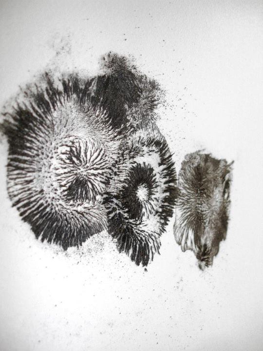 Nous retrouvons la limaille de fer dans une série de six dessins, où sur du papier blanc la matière brute est libérée, comme imprimée, puis cristallisée [Limaille Fossilisée, 2011-2012]. Les dessins apparaissent à la fois comme les résidus et les extensions de l’installation mécanique. Les motifs formés par le dépôt de fer font écho aux intérieurs de roches, aux cellules minérales, humaines ou végétales vues avec un microscope ou autre machine de précision visuelle. L’artiste utilise chaque propriété, chaque contrainte et chaque possibilité pour en extraite l’inattendu, l’improbable. Comme pour la série des Petits Colosses (2012), dont trois pièces sont présentées à l’étage. Des caissons de verres sont intégrés à des colonnes blanches, au sein des caissons sont cristallisés les résultats produits par la machine Resonarium. Les entités de limaille de fer apparaissent comme des caryatides précaires, liant deux parties de la colonne. La construction fragile semble soutenir le tout. Une fois de plus, le déséquilibre visuel et matériel est mis en avant. Entre vulnérabilité et solidité, les matériaux sont détournés et redéfinis.