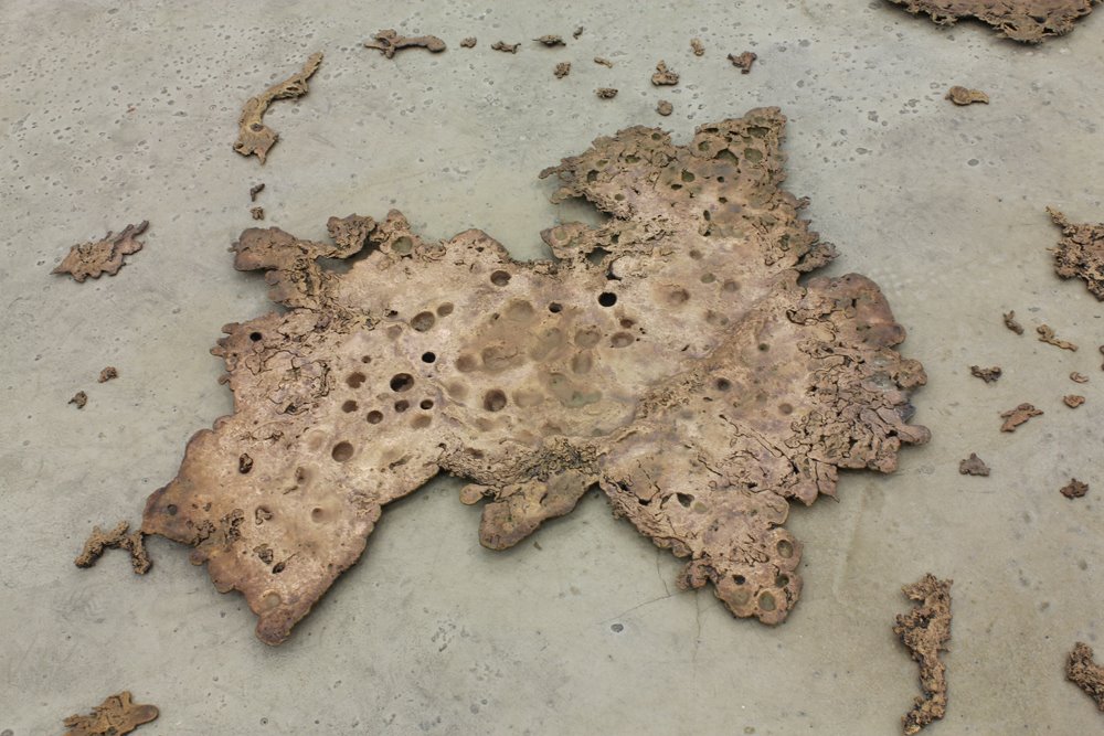 This wall map relates to a physical display set on the gallery’s floor. Les Bouts du Monde, work which gives its name to the exhibition, is composed of bronze fragments laid on the gallery’s floor. As artist-in-residence in Franche-Comté, he worked in a studio near a bronze foundry, with which he became familiar and came to know every day. During the casting, jets of liquid metal formed solid scraps on the floor. Then, he started to collect the discards, and cast liquid bronze directly onto the floor to obtain bigger images. He thus kept more than three hundred pieces of different sizes. These are now part of the exhibition and considered as additional islands, pieces of the world. Islands born by chance, bringing to life a related but imaginary map.