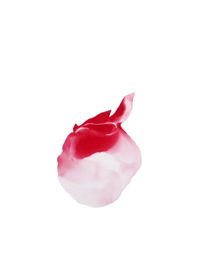 Par séries de trois, quatre ou cinq toiles blanches, de différents formats, du plus grand au plus intime, Natalie Lamotte met en mouvement une symphonie de corps informes imbibés d’un rouge flamboyant. Ils semblent flotter dans l’espace limité de la toile et sont comme figés dans le temps. Une méduse, une racine, un bulbe, un sexe féminin, une cellule microscopique, végétale, animale, humaine ? Un organe fragmenté, désolidarisé, une bulle, un pétale, un embryon… Les taches rouges recèlent une pluralité de lectures et d’interprétations. Elles n’enferment et n’excluent aucune proposition, bien au contraire elles libèrent l’esprit et l’imagination. Selon le vécu, le ressenti, les appréhensions et les références du regardeur, elles le portent de l’infiniment grand (le cosmos, l’océan et la vie au sens le plus large) jusque l’infiniment petit (les cellules, les nano organismes, les fluides). Pour ces raisons, elles effraient, étonnent et émerveillent. Les taches rosées et rougeâtres, à la fois lumineuses et obscures, fragiles et intenses, profondes et légères, sont des corps instables avec qui l’artiste engage un subtil dialogue avec son propre corps et la toile. Elle nous enjoint à expérimenter la lenteur et la rêverie à travers la production d’un motif aux contours inépuisables.