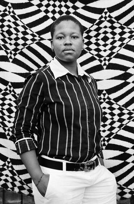 Elle se définit comme une « photographe et travailleuse communautaire », qui est à l’initiative du premier fond d’archives photographiques de toutes ces femmes bannies et marginalisées.[2] Ce sont des femmes en résistance. Leurs visages expriment leurs existences, leurs personnalités, leurs individualités et leurs singularités. Chaque portrait témoigne positivement de la diversité sociale des Black Queers, qui sont constamment désignées de manière négative et honteuse dans la société sud-africaine (tout comme en Ouganda, au Malawi ou en Iran où l’homosexualité est passible de la peine de mort). En Afrique du Sud les Black Queers perdent même leur identité africaine, puisque leurs modes de vie ne correspondent pas à l’archétype de la femme africaine : une épouse et une mère, à la tête d’une famille nombreuse. « En manquant à ces attentes, nous sommes perçues comme des déviantes, nécessitant ‘un viol curatif’ pour effacer notre attitude masculine et faire de nous de vraies femmes, des femelles, de véritables femmes, la propriété des hommes. » Zanele Muholi insiste sur le fait que les lesbiennes noires, lorsqu’elles font l’objet de sujets de presse, sont toujours inscrites dans une bulle sensationnelle : des faits divers macabres, des viols, des molestages etc. Les portraits de Muholi montrent des femmes actives, créatrices, à hautes responsabilités. Elles expriment une image sereine de leur communauté qui est en phase avec la société. Plusieurs des femmes rencontrées pour les projets ont aujourd’hui disparu, à cause des assassinats sauvages, du Sida et des autres méfaits subis par la communauté. La série Faces and Phases rend hommage aux Black Queers, passées, présentes et futures. « Je voulais capturer des photographies de ‘mon peuple’ avant que nous n’existions plus ».[3]