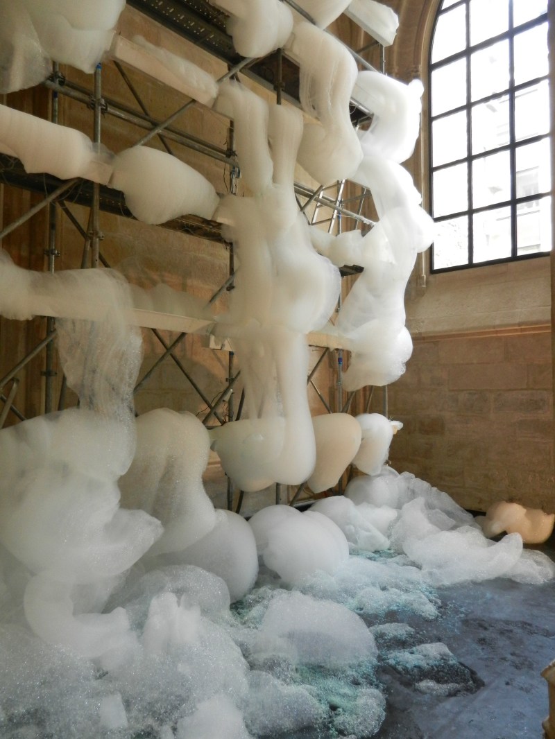 Lorsqu’on pénètre dans l’espace, le silence règne et l’odeur du savon est présente, forte, déroutante. Au bout de quelques minutes, nous n’y faisons plus attention, nous sommes rapidement happés, surpris et joyeusement envahis par l’installation devant laquelle il nous prendre le temps de contempler la mousse en mouvement. Michel Blazy a en effet monté un échafaudage devant le mur du fond de l’ancienne sacristie. Des barres métalliques brutes, enchevêtrées, parmi lesquelles il a disposé des jardinières en plastique. Les bacs sont remplis de savon et d’eau, deux matériaux que des petits tuyaux vont faire interagir. En effet, dans les tuyaux (semblables à ceux que nous pouvons voir dans les hôpitaux pour les transfusions) circule de l’air, qui, au contact de l’eau et du savon, forme des milliers de bulles. Ainsi des amas mousseux voient le jour, ils se développent lentement, du matin jusqu’au soir, jusqu’à recouvrir l’échafaudage et finalement tomber sur le sol. Comme l’envers du décor d’un spectacle, d’une pièce de théâtre, l’échafaudage va soutenir et organiser le paysage mousseux qui va, au fil des heures, se dessiner devant nos yeux. L’œuvre joue sur la fragilité de la matière, son éphémérité et son caractère expansif.