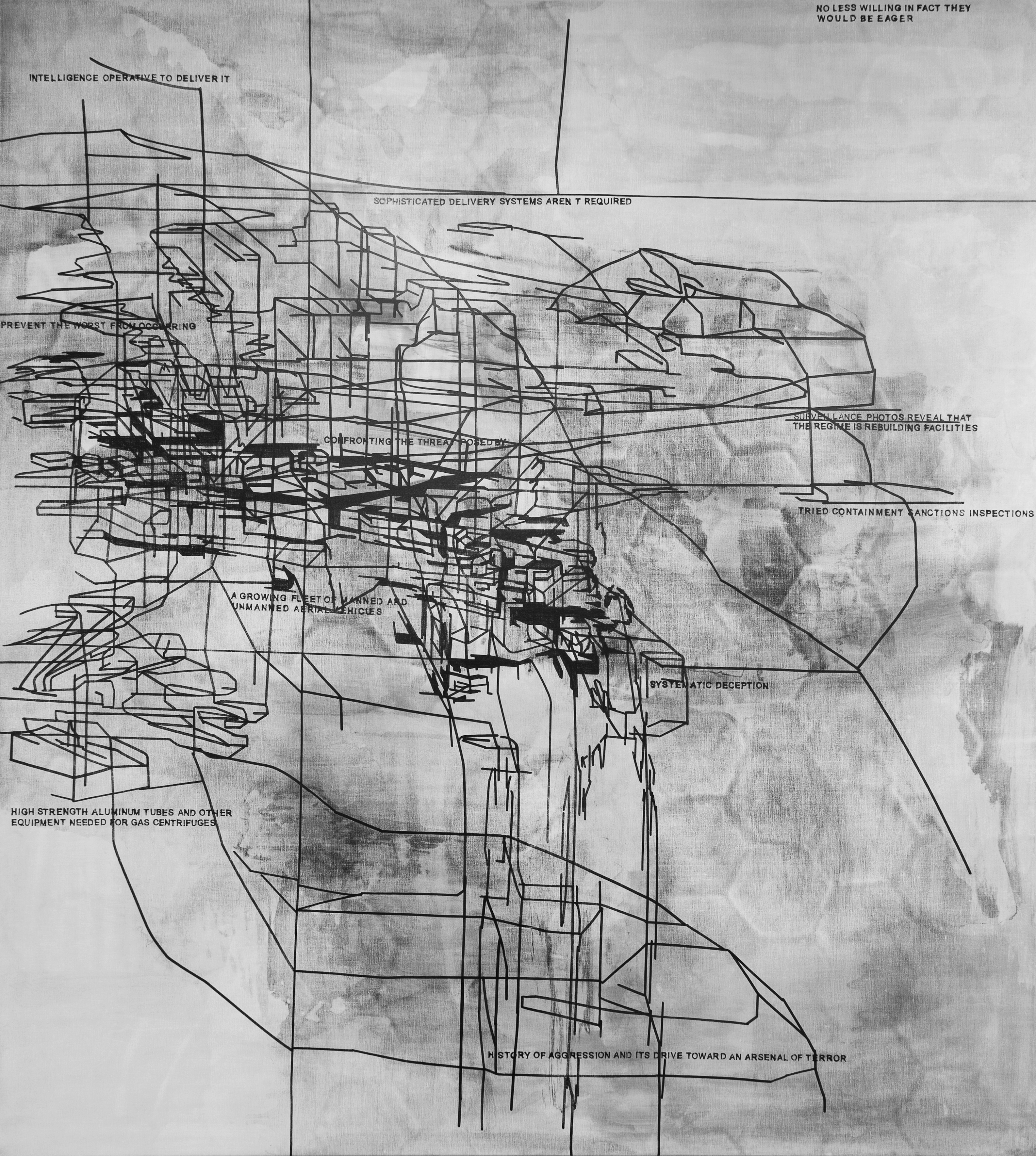 « Les dernières productions de Laurent Ajina marquent une nouvelle étape dans sa démarche artistique. Celle-ci était jusque-là uniquement identifiée par l’exécution des Site Specific Drawings sur les murs des différents lieux d’exposition qu’il est invité à investir de ses markers noirs. À même le plâtre, la peinture ou le béton, il étire des réseaux qui viennent composer l’espace. Il prolonge les lignes préexistantes et génère une véritable résille graphique concrétisant de manière temporaire une totale fusion entre l’artiste et le lieu. Les compositions rhizomiques traduisent une dynamique, une relation intense entre son corps et l’espace dans lequel il agit. Aujourd’hui, il déploie ses dessins au-delà des murs et formule une œuvre sérielle à travers laquelle il précise et développe sa relation à l’espace, à l’environnement, au bâti et à la mémoire. » … … …
