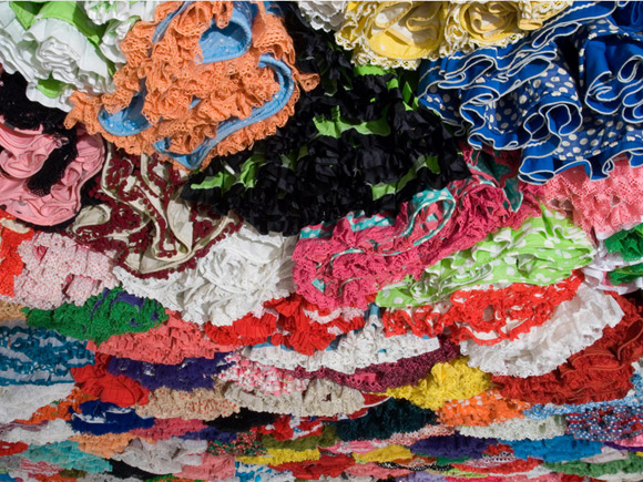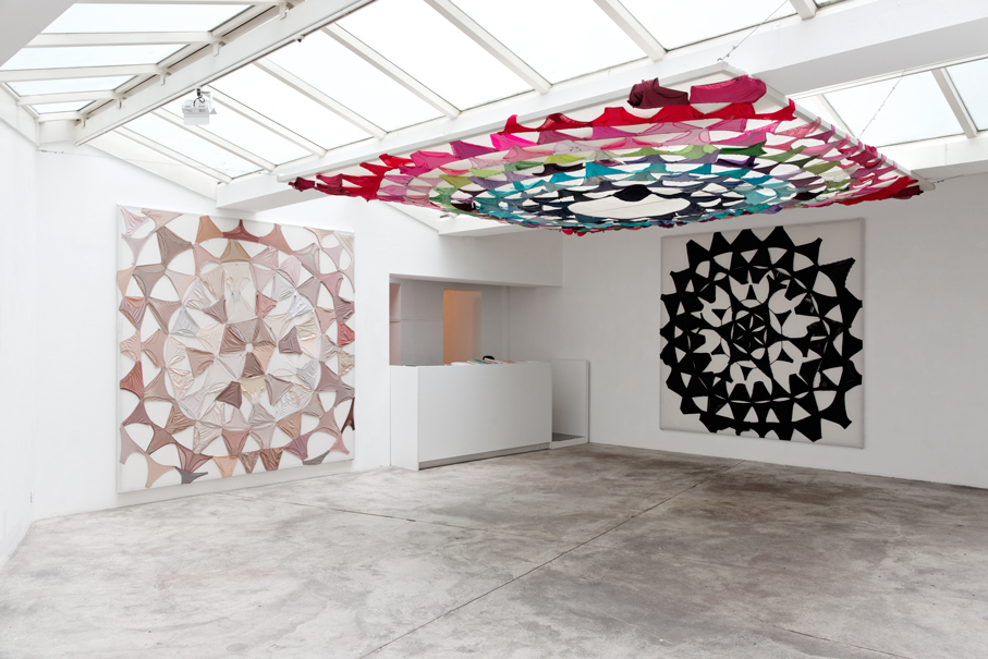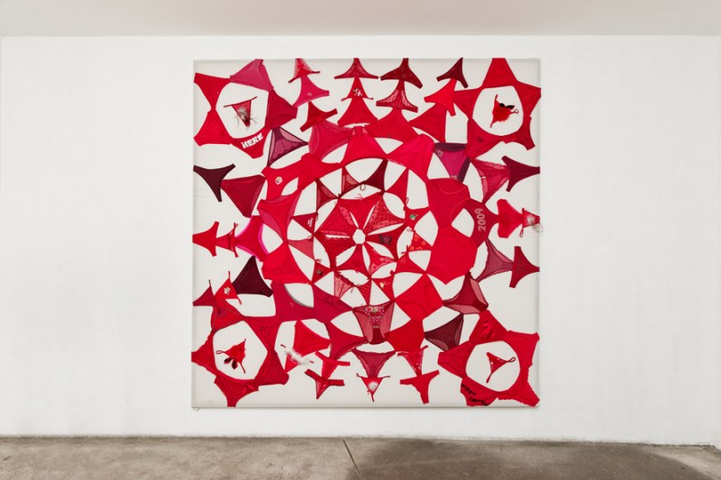 Dans cette perspective, elle construit un espace compris comme un sanctuaire à la fois privé et public, intime et partagé, où les femmes existent dans une infinie pluralité. Une série formée de cinq mandalas en témoigne. Des culottes, des slips, des strings et des tangas assemblés et cousus par couleurs, sont fixé sur quatre toiles blanches et une toile recouverte de tissu noir. Mandala (Rouge) – 2012 est composé de lingerie rouge, à dentelles, échancrées, en soie, en organdi, il évoque l’érotisme, la séduction, la passion, le désir. Il trouve son pendant avec Mandala (Noir), plus mystérieux mais non moins affriolant. Mandala (Chair) et Mandala (Blanc) – 2012, incarnent la pudeur, la discrétion, la virginité. Tous les styles sont assemblés, ils correspondent à tous les âges, toutes les classes, toutes les cultures. Une pluralité signifiée par le Mandala (Arc-en-ciel) – 2012 qui est suspendu au plafond et qui semble protéger l’espace. Les visiteurs sont ainsi entourés de cultures multicolores la diversité féminine et non plus LA femme. De la ménagère à la préadolescente, de la femme d’affaire à la prostituée, de la retraitée à la trentenaire célibataire, chacune peut se retrouver dans ces mandalas textiles. Il est à noter que les mandalas sont traditionnellement conçus par des moines (uniquement des hommes) à partir de peinture ou de sable. Ils véhiculent des prières et un travail méditatif. Pilar Albarracin revisite et réinterprète un art millénaire en imposant au regardeur ce qui est habituellement cachés, puisque la lingerie relève de la vie privée. Le sacré et le trivial dialoguent harmonieusement.