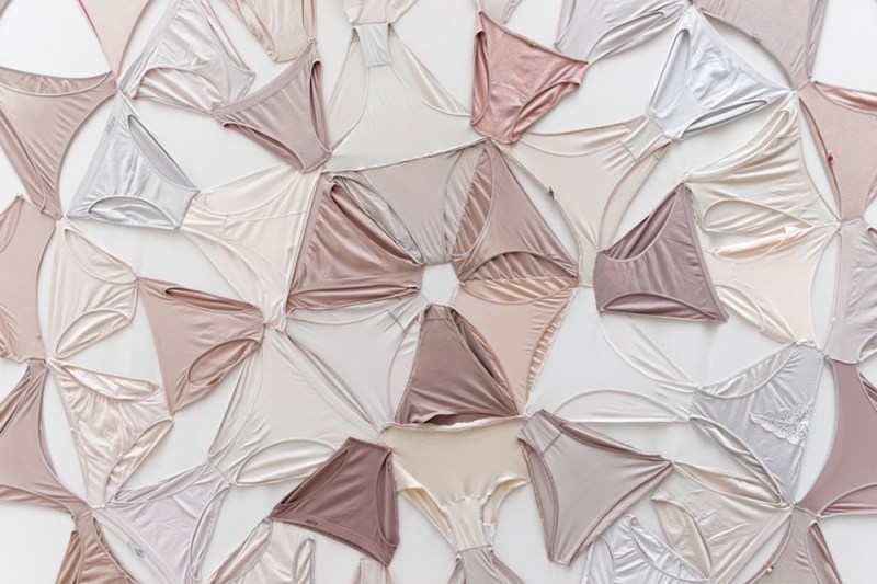 El Origen Del Nuevo Mundo est une véritable célébration des femmes, de leurs corps et de leurs identités. Elles sont unies dans leurs différences. Sous ses aspects cocasses, provocants et colorés, l’exposition de Pilar Albarracin engage une réflexion critique d’une histoire de la représentation du sexe féminin, de Courbet jusqu’aux artistes féministes. La trivialité de son objet d’étude, la culotte, souligne avec malice et pertinence qu’elle peut aussi nous renvoyer à des considérations non seulement sexuelles et artistiques, mais aussi sociologiques, religieuses, psychologiques etc. Les culottes nous renvoient à nous-mêmes, à notre propre expérience. Elle explique : « La Culotte, pour moi, c’est beaucoup plus fort car c’est ce qui fait écran entre la réalité et l’intériorité de la femme, le cosmos… C’est d’ailleurs pour cela que j’ai choisi de réaliser ce projet sous la forme de mandalas. Derrière la culotte, derrière la vulve, il y a une unité, une circularité que je voulais représenter. C’est quelque chose de caché, mystérieux que l’on traite avec une mysticité étonnante. »[3] Un objet d’étude universel et spécifique que l’artiste emploie pour créer des œuvres où les femmes sont rassemblées pour donner vie à des cosmologies féminines au sein desquelles les individualités sont cousues entre elles, ainsi elles se font collectives et solidaires. Elle produit un infini féminin.