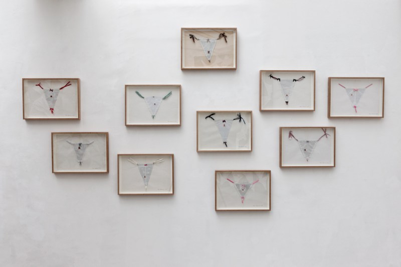 L’Origine du Monde se transforme en El Origen del Nuevo Mundo (« L’Origine du Nouveau Monde »), l’artiste part à la conquête d’un nouveau territoire, un Nouveau Monde, que plusieurs générations de femmes artistes féministes ont construit progressivement depuis le début du XXème siècle. Un territoire détaché du discours dominant porté sur les femmes, où elles établissent de nouveaux codes, de nouvelles normes et de nouvelles conceptions. Des alternatives non seulement à la représentation des femmes, mais aussi à leurs statuts et leurs conditions au sein de la société. Dès les années 1930-1940, les femmes artistes peignent le sexe féminin, Frida Kahlo avec violence, Georgia O’Keeffe dans la métaphore. Un travail que les artistes féministes actives durant les années 1960 jusqu’à aujourd’hui ont poursuivi : Judy Chicago, Valie Export, Ghada Amer ou encore Lamia Ziadé. La représentation du sexe féminin par les femmes artistes devient un acte de résistance, un acte politique engagé envers la cause des femmes. Pourtant, Pilar Albarracin utilise la lingerie comme une métonymie, le sexe féminin est présent mais non visible, il est induit. L’artiste présente également une série de dessins encadrés, représentant des culottes stylisées, un triangle de papier découpé et des petites lanières en tissus, au-dessus desquelles des petites fenêtres sont ouvertes : sur l’espace, les étoiles, les galaxies (L’Origine du Nouveau Monde – Big Bang) ou bien sur des fragments de corps, de seins, de sexes. Entre présence et absence, visible et invisible, tout y est dosé, équilibré. Elle réintroduit une intimité dans ce Nouveau Monde où les femmes sont libres, indépendantes et maîtresses de leurs corps.