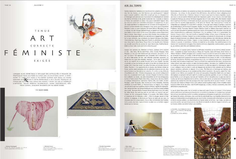 Quelles relations les institutions et le marché de l’art européens entretiennent avec l’art des femmes, avec l’art féministe plus spécifiquement ? L’adjectif pose un premier problème : celui d’être accepté par tous. Si le Royaume-Uni et l’Allemagne sont pionniers dans l’avancement et le développement constant des théories féministe et des Gender Studies dans leur ensemble, on observe en France non seulement un retard, mais aussi un désintérêt flagrant. Alors que dans de nombreuses universités américaines et européennes, les Gender Studies bénéficient de départements de recherches et d’enseignement, ils peinent à se faire entendre dans l’hexagone. Nous savons que le mouvement féministe a connu un essor prodigieux de l’autre côté de l’Atlantique, l’art qui en découle de Judy Chicago à Barbara Kruger en passant par Cindy Sherman, Kara Walker et Jenny Holzer. Si l’on pense à des artistes comme Ghada Amer, Marlene Dumas, Mona Hatoum ou encore Shirin Neshat, nous constatons que les artistes diasporiques affichent une radicalité et un engagement sans faille. Sur le vieux continent, nous connaissons les figures historiques comme Valie Export, Chantal Akerman, Paula Rego, Rosemarie Trockel ; la génération intermédiaire avec Jenny Saville, Sonia Boyce, Tracey Emin et la nouvelle scène féministe qui accueille aujourd’hui les œuvres de Joana Vasconcelos, Zoulikha Bouabdellah ou Ninar Esber. Qu’en est-il de la scène française ?