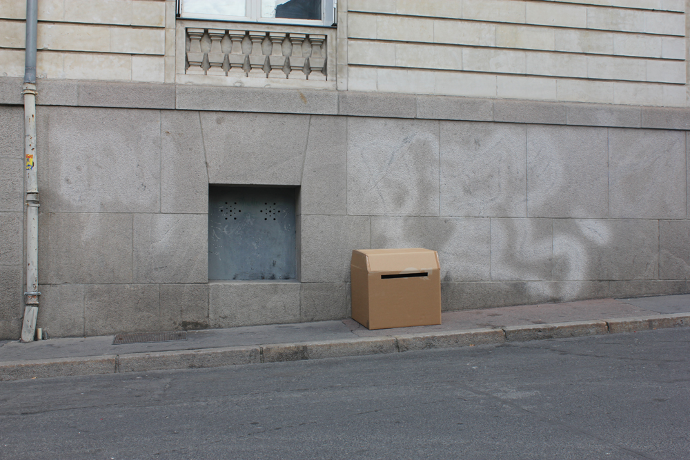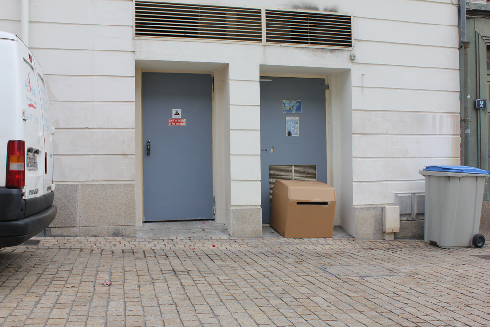 Pour le déplacement du bunker en carton, Régis Perray a opté pour des positions stratégiques de défense : toujours adossé à un mur afin que personne ne puisse l’attaquer par derrière ou bien le contourner. Paradoxalement, le bunker est exposé publiquement. Parce qu’il est fabriqué à partir de carton, un matériau provisoire, il est rendu vulnérable. L’artiste adopte une posture dichotomique qui rend compte de la complexité de cette guerre vécue par beaucoup comme un bombardement ou une infraction. Il souligne ainsi le sentiment d’extrême solitude que rencontrent les personnes les plus touchées par l’instabilité économique et sociale. Une situation de crise qui amplifie l’individualisme, le repli sur soi traduit par le bunker dans lequel l’individu est partiellement enfermé. Le mal être social est rendu visible, il s’installe dans la rue et tente de communiquer avec les passants, les autres, eux-mêmes contaminés. Un retranchement qui rejoint la vie et la pratique artistique de Régis Perray. En effet, depuis le début de sa carrière, il travaille le plus souvent seul, en produisant lui-même ses actions et ses constats. Le bunker rejoint alors une nécessité d’expérimenter le réel de manière indépendante. Il explique d’ailleurs qu’il est « à l’image de ce que je fais souvent, travailler seul, être sur un chemin personnel et pas dans le collectif pour partager, construire, lutter. Mais plus à tracer ma voie loin des grandes idées et des théories économiques et sociales qui observent cette crise mondiale. L’union fait peut-être la force, mais avec de moins en moins de « force » l’individu essaie de s’adapter comme dans une « jungle », un peu perdu. »