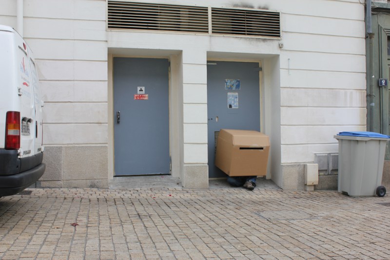 Alors la violence d’une guerre est mise en évidence, elle s’impose et se déplace. La crise économique induit en effet un nomadisme économique, à l’échelle mondiale avec les mouvements migratoires, mais aussi à l’échelle d’une ville, d’une vie. Sans Domicile Fixe. Si une personne ne parvient plus à payer son loyer ou toutes autres formes de remboursements échelonnés, les conséquences sont implacables : elle doit rapidement apprendre à survivre dans la rue. Il lui faut d’abord trouver un abri ou bien le construire de ses propres mains. Dans l’urgence, les matériaux disponibles ne sont pas nombreux : plastiques et cartons. Ces derniers sont associés au transport de marchandises, qui, une fois déposées sur les trottoirs, sont vidées de leurs contenus et deviennent un matériau de résistance quotidienne. Les cartons sont également liés aux déménagements, aux emménagements, des départs, des arrivées. Ils nous renvoient à différents phénomènes comme les expulsions, l’insécurité, la solitude ou encore l’impuissance. Le bunker en carton induit une expérience violente et impitoyable. Régis Perray explique : « La guerre détruit nos biens nos maisons, nos villes, nos pays, la guerre économique détruit aussi notre quotidien, notre travail, nos économies… au moins, peut-être, elle ne peut détruire un Blockhaus en carton. »