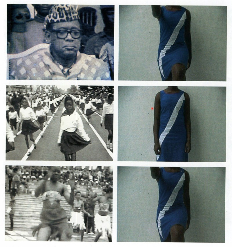 The work of the Franco-Congolese artist Michèle Magema comes in many forms since she develops installations, videos, photographs and performances equally happily. She revisits black history from her own critical and relevant point of view. Through her personal experience, she offers us new angles of interpretation for a history that has long been presented from a single perspective. Cultural hybridity and thinking about the colonial past in visual terms are central to her creative practice. Born in Kinshasa (in the Democratic Republic of Congo) in 1977, she settled in France with her family in 1984: political exile explained by her father’s refusal to submit to the dictatorial power of Mobutu Sese Seko (1930-1997) who ruled Zaïre with an iron fist. The Magema family left the country to lead a free life. She went on to study for five years at the Ecole Nationale Supérieure d’Arts in Cergy, and was awarded a degree in visual and performing arts. Her work attracted the attention first of the organizers of the Bamako biennial, then those of the Dakar biennial, where she showed Oyé Oyé (2002), a video work for which she was awarded the Prix du Président de la République Sénégalaise in 2004. Oyé Oyé is a confrontation between two screens, the first presenting the leader Mobutu in black and white presiding over an official parade, like a king, and the second presenting the artist herself in colour, dressed in the compulsory school uniform which she recreated based on her childhood memories. In a blue dress with a diagonal white band acrossit, the artist whose faceis deliberately obscured by a framing centred on her body simulates a military march. By making fun of the daily obligationsintroduced by the dictatorial policy of the man known as “The Leopard of Kinshasa”, the artist establishes a criticism of that policy. The military marchis made ridiculous, asis the posture adopted by Mobutu. A criticism of dictatorships, but also of the use of the female body for propaganda purposes (at parades, official dances, etc.). The anonymity she preserves by hiding her faceindicates thatit could be any woman of that period. The artist’s body carries a collective message, embodying the feminist slogan chanted at the end of the 1960s: “personalis political”.