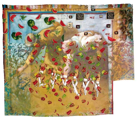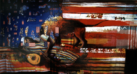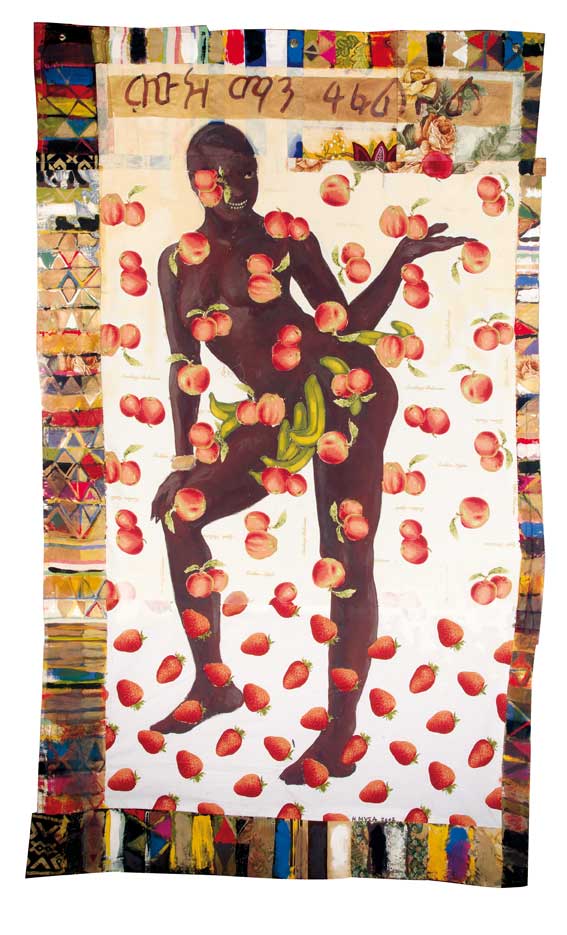 Il a pourtant accepté de participer à Africa Remix, car s’il ne s’inscrit pas comme étant acteur de l’art contemporain africain il ne pourrait quasiment jamais présenter son travail à un large public. Ses rares participations aux expositions artafricanistes sont toujours accompagnées d’un projet critique. Il se glisse dans les interstices du système dominant pour l’enrayer au moyen de ses peintures textiles et de discours pertinents. Joséphine Baker a su jouer de son image et de son identité en tant que femme noire. Elle assumait parfaitement sa minijupe à bananes et ses représentations en cage (contrairement à Sawtche qui les subissait violement). Hassan Musa écrit que : « Cette cage représentait, dans l’esprit du public européen, une métaphore clé de la culture de domination qu’a engendré la société capitaliste en Europe. En tant qu’espace d’oppression et d’ordre où l’on peut classer et contenir les énergies et les êtres du monde « désordonné », la cage apparaissait comme la place appropriée pour les Africains. »[11] L’artiste combat cette « cage » africaniste dans laquelle la société et l’histoire voudraient le contraindre.
