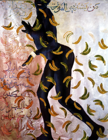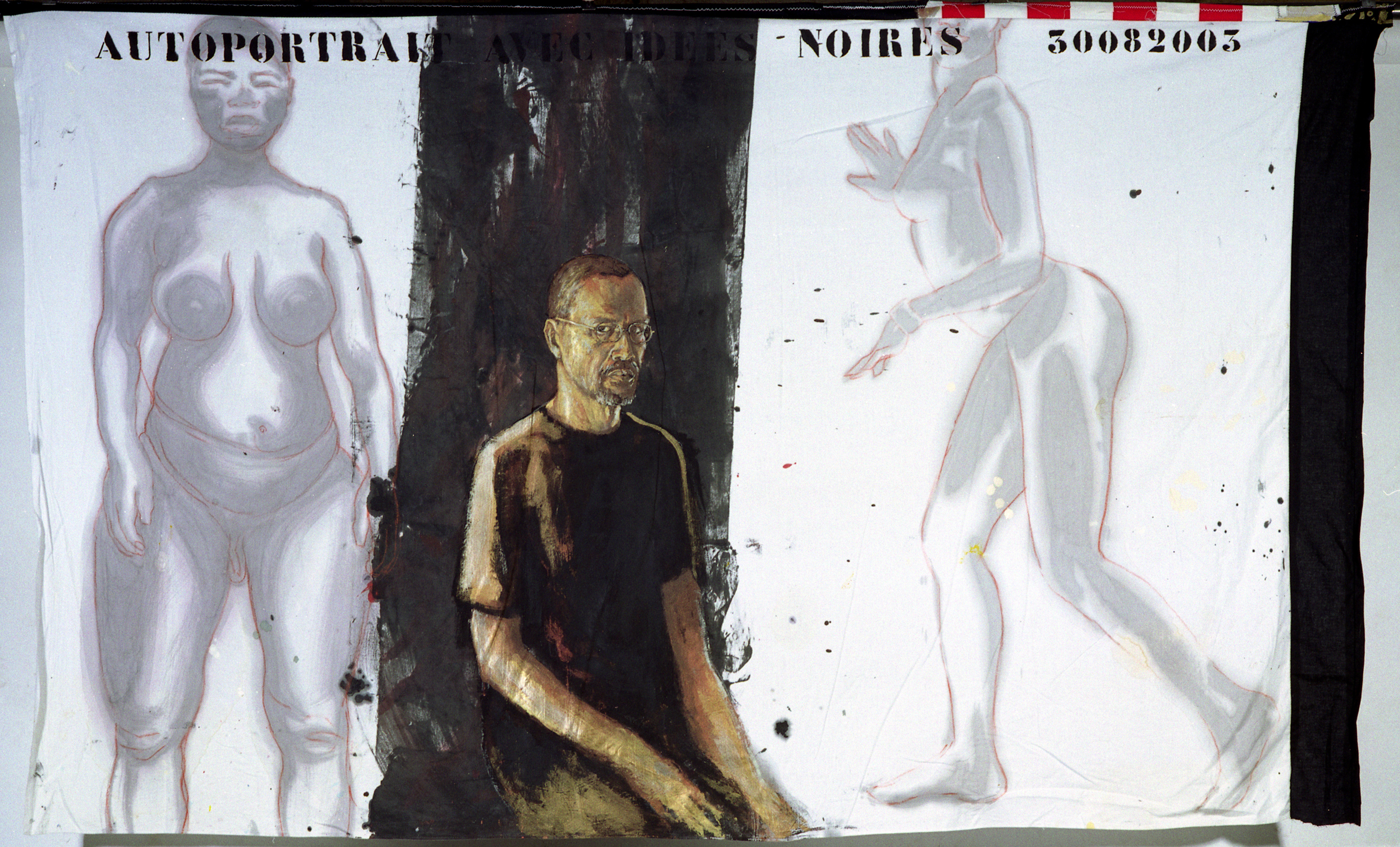 Il est intéressant de noter qu’il a observé avec attention l’historiographie des expositions et de toutes les autres formes de monstration de l’exotisme : objets, humains, animaux etc. Des recherches qui l’ont mené à développer une réflexion iconographique, théorique et critique sur deux figures de l’histoire noire : Sawtche (dite « la Vénus Hottentote ») et Joséphine Baker.[7] Hassan Musa compare volontiers les deux femmes, qui, si elles ont connu des vies très différentes, portent en elles des points communs qu’il souligne ainsi : « Ce qu’il y a de commun entre l’expérience de Baker et celle de Sawtche, est que chacune d’elles a été mise sur scène en face d’un public européen masculin. Mais la différence entre les deux femmes résiderait en l’attitude affichée par chacune d’elles par rapport au fait d’être considérée comme une femme noire. »[8] Joséphine Baker et Sawtche apparaissent comme deux icônes du panthéon de l’artiste, qu’il représente de manière récurrente dans ses peintures textiles. Prenons l’exemple de l’œuvre intitulée Autoportrait Avec Idées Noires, où il apparaît au centre de la composition, assis de trois-quarts. La figure de Musa est peinte sur un fond noir, tandis que de part et d’autre de son corps sont représentées, sur fonds blancs, à gauche Sawtche, à droite Joséphine Baker. Leurs corps nus sont comme esquissés. Sawtche est de face tandis que Baker est présentée de profil. Une femme exhibée de force, un homme artiste refusant d’être considéré comme un être exotique et une femme qui a su exploiter un statut exotique pour créer au-devant de la scène. Trois personnages, trois époques différentes. Joséphine Baker jouait avec son corps, alors que les Européens, quelques années auparavant, ont joué avec le corps de Sawtche. En ce sens, elle incarne l’Artafricanisme puisqu’elle s’est conformée aux attentes européennes et a su jouer de son corps prétendument exotique pour accéder au succès et à la reconnaissance internationale.