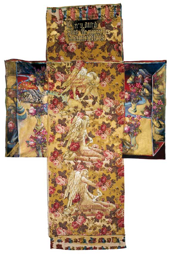 Lorsqu’il arrive en France en 1979, n’ayant aucune ressource, il va collecter différents matériaux et outils afin de poursuivre son œuvre initialement développée au Soudan. Il pratique donc « l’art de la récupération », un concept dont il se méfie car la critique occidentale affuble bien trop souvent une étiquette généraliste à l’art contemporain africain.[1] Il récupère, collecte, assemble et construit le fond de ses peintures avec divers morceaux de tissus qu’il sélectionne avec soin pour leurs couleurs, leurs textures, leurs motifs et leurs symboliques. Il n’instaure pas un travail de couture « bien finie », ceci afin de se dissocier de toute forme artisanale, fonctionnelle, décorative ou traditionnelle. Il coud les tissus de manière asymétrique, sans se soucier de la précision des points ou même du fait que les coutures soient alignées et droites. Une manière de procéder qui ajoute une valeur esthétique à son œuvre, celle-ci se révèle être un véritable collage textile. Il choisit systématiquement des morceaux de tissus de grandes dimensions afin de conférer à ses peintures textiles une plus grande profondeur de vue, ainsi que des similitudes avec l’art de la tenture et de la tapisserie.