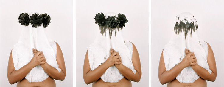 Elle développe ainsi une pratique protéiforme en utilisant aussi bien la photographie, la vidéo, la performance et l’installation. Différents médiums grâce auxquels elle met en œuvre son propre corps. Reconnue en Afrique du Sud et sur la scène internationale, elle s’est fait connaître du public en 2001 lors de la Biennale de Venise où elle a présenté une installation photographique intitulée Still. (1) L’œuvre est formée d’extraits d’œuvres vidéo antérieures comme Colour Me et Snow White. Deux pièces emblématiques de son travail qui démontrent son attachement à la sculpture, médium auquel elle se destinait au départ. Snow White est sa première œuvre vidéo, elle s’y présente agenouillée dans un espace sombre et apparemment infini, l’artiste est totalement nue, elle est impassible au flot de farine qui recouvre peu à peu son corps. Elle débarrasse ensuite sa peau des particules blanches et pétrit une boule de pain disposée devant elle. Elle prépare un pain spécifique, le rôti, un pain indien dont la recette lui a été transmise par sa mère et sa grand-mère. Le rôti apparaît alors comme un élément survivant de son héritage à la fois maternel et métis. L’œuvre souligne un plan personnel en faisant référence à ses origines métisses, et parallèlement un plan collectif en signifiant la complexité des rapports raciaux en Afrique du Sud.