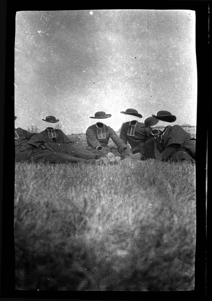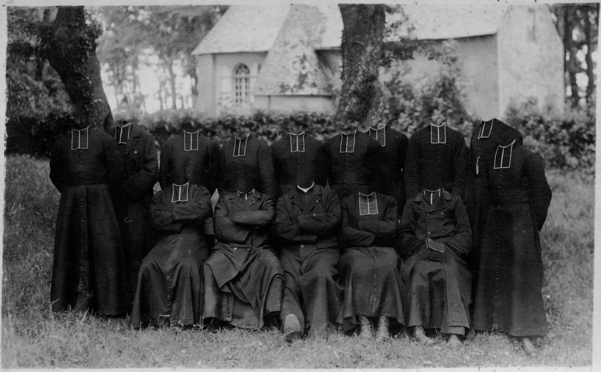 La série Headless est née d’une volonté de l’artiste d’entreprendre une archéologie familiale pour en décrypter les mécanismes idéologiques, ainsi que leurs inévitables incidences sur sa propre vie. Suite au décès d’une tante, il récupère une boite de négatifs, il les rassemble et les laisse de côté. Plus tard, il découvre un document daté de 1940 où il apprend que son grand-père a collaboré avec l’Allemagne nazie en vendant du vin aux soldats allemands installés en Bretagne. Un document à la fois terrifiant et déclencheur d’une recherche plus approfondie. Erwan Venn revient vers les négatifs photographiques, il les scrute avec attention, décode les indices (lieux, identités, évènements) et retrace ainsi le parcours de son grand-père. Ce dernier est éduqué selon les préceptes d’une morale pieuse, rigide et contre révolutionnaire. Jeune, il se tourne vers la religion en intégrant le petit séminaire. Un passage dont il subsiste quelques images en noir et blanc. Des photographies de groupes où les jeunes séminaristes posent stoïquement, bras croisés et derrière le dos, ou de manière plus candide, assis et allongés dans l’herbe. Des photographies qu’Erwan Venn modifie numériquement en prélevant les têtes de chacun des figurants. Sans tête, sans visage, ils perdent toute forme d’identité et d’individualité. Ils ne sont plus que des costumes, des corps flottants, fantomatiques. Sans têtes, ces hommes, alors considérés comme les « soldats de dieux », se résument à leur mission idéologique. L’artiste met en lumière les rapports étroits entre le clergé et le politique, mais aussi les rouages d’une propagande rampante.