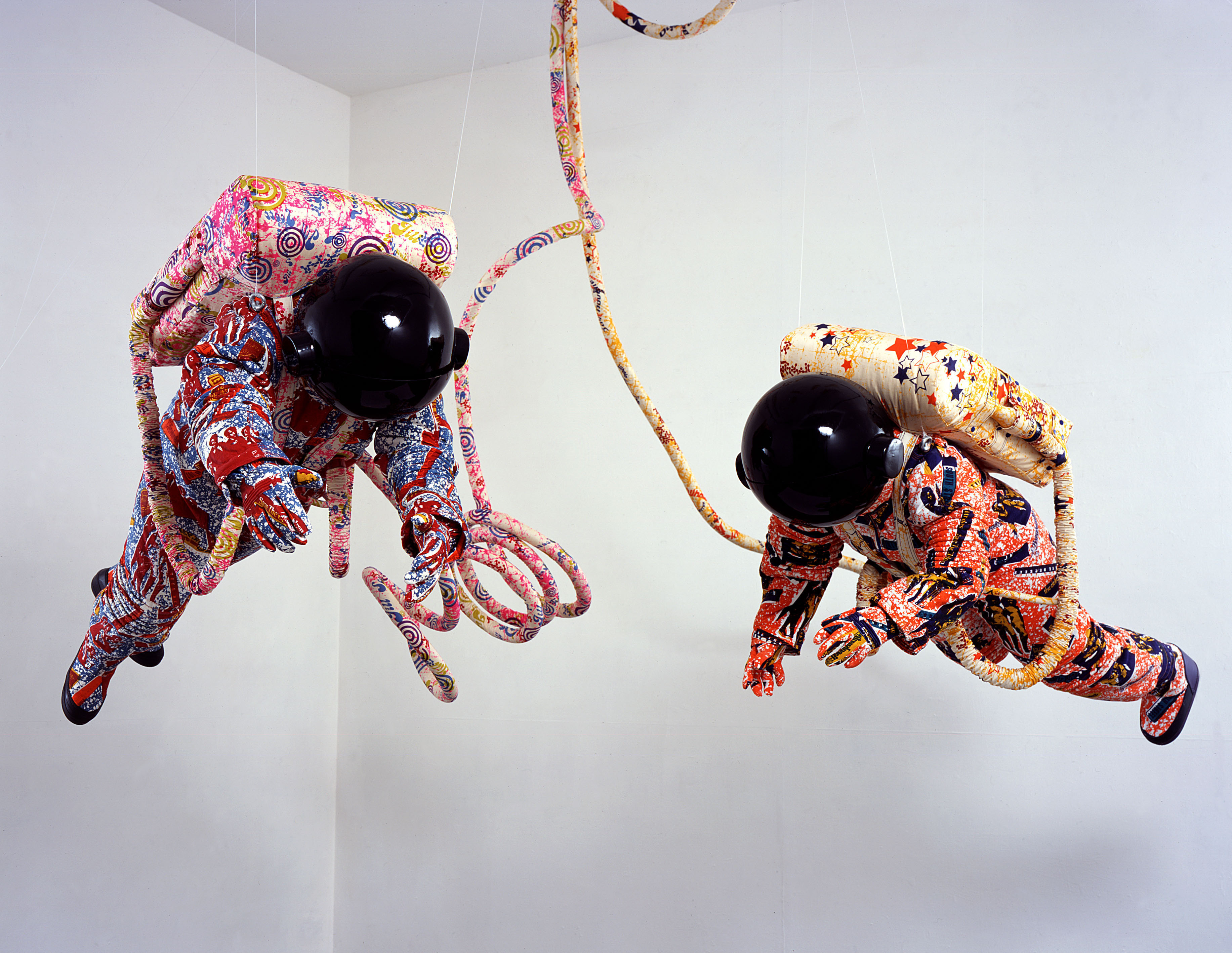 Un instinct d’explorateur que Shonibare développe avec Vacation (2000), une installation présentant une famille humaine composée de quatre personnes : deux adultes et deux enfants, tous vêtus de combinaisons spatiales fabriquées à partir de Dutch wax. Ici, ce sont les humains qui partent en vacances dans l’espace. L’artiste fait aussi référence à une nouvelle forme de colonisation. Il explique : « L’exploration de l’espace est l’expression d’une nouvelle forme de colonialisme tant qu’elle fournit une profusion de nouvelles possibilités, de la même manière que l’ivoire de l’Afrique au XIXème siècle a fourni de nouvelles possibilités de richesse. Les gens sont gourmands et veulent des territoires à explorer pour trouver de nouvelles ressources qu’ils peuvent changer en argent et en capitalisme. »[4] Il est intéressant de retourner le discours et de penser que lorsque Christophe Colomb a accosté sur les rives du Nouveau Monde avec son équipage, ou bien lorsque les premiers missionnaires européens se sont installés en Afrique, ils ont été perçus comme des extraterrestres par les populations autochtones. Nous sommes tous les étrangers de ceux que nous considérons comme les étrangers. Avec humour et subtilité, l’artiste inverse les points de vue en déplaçant le regard du prétendu « dominant » et ouvrant le champ de la perception afin qu’il ne soit plus envisagé d’une manière unilatérale. En 2002, il réalise Space Walk, une installation composée de deux spationautes dont les combinaisons sont conçues à partir de Dutch wax, ainsi que d’une capsule spatiale sur laquelle est inscrit le nom de Martin Luther King. Les deux personnages sont reliés par deux cordons en Dutch wax à la capsule. Ils portent des casques totalement noirs et opaques, empêchant le regardeur d’identifier leurs visages et leurs expressions. L’œuvre est présentée accrochée au plafond, surplombant le public qui se doit de lever la tête pour observer l’étrange scène flottante. L’installation aérienne interroge le besoin insatiable des hommes de conquête et d’une fascination pour l’ailleurs. Pourtant, le fait que les combinaisons et accessoires matériels soient fabriqués à partir de Dutch Wax, nous laisse penser que ces futures conquêtes ne seront pas irrémédiablement blanches/occidentales. Les personnages portent des casques spatiaux dont les visières noires et opaques, ne nous permettent pas de les identifier (âge, race, sexe, traits de personnalité). Des indices auxquels il nous faut ajouter la capsule qui porte le nom du célèbre pasteur Africain-Américain, ce dernier implique la disparition des barrières raciales entre les hommes. À travers une iconographie futuriste et un héritage (historique, culturel et théorique), Yinka Shonibare réclame un avenir multiculturel, ouvert et libre. Être visible et ne pas être considéré comme un étranger tel est son souhait le plus cher. Pour cela, il explore le passé, les utopies et le futur pour en extraire les contradictions, les aberrations et les failles.
