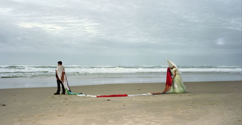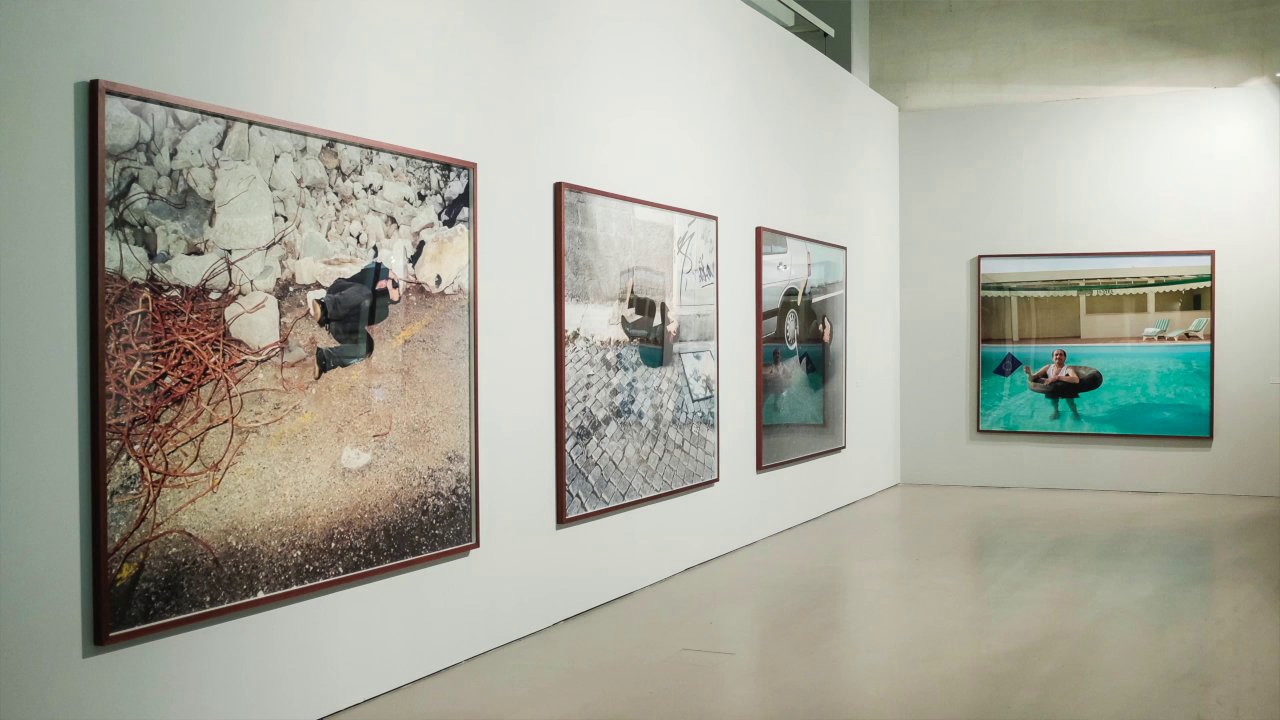 Le CAM (Centro de Arte Moderna) – Fundação Calouste Gulbenkian à Lisbonne présente la première exposition-anthologie de l’œuvre de João Tabarra. Elle réunit un ensemble impressionnant de photographies en grand format et de vidéos qui permettent au visiteur de revenir sur plus de vingt ans de création. L’exposition repose sur une lecture de type rhizomique plutôt que chronologique. Les œuvres sont interconnectées par une série de problématiques que l’artiste travaille et approfondit sans relâche. Les photographies sont les résultats de mises en scène méticuleuses dans lesquelles l’artiste est son propre sujet. Pourtant, le propos n’est pas autobiographique, Tabarra réfléchit aux notions d’appartenance et d’être au monde en déployant des sujets comme la présence, le temps, le paradoxe, le non-renoncement ou encore la chute.[1] Influencé par le cinéma (Jean-Luc Godard, Buster Keaton), la littérature (il parle avec délectation des œuvres de Sartre) et la philosophie (il cite celui qu’il appelle « Chéri Deleuze »), João Tabarra tisse une pluralité de fictions matérialisant visuellement et physiquement ses questionnements. Selon des approches absurdes, poétiques et/ou critiques, il apparaît quasi systématiquement vêtu d’une chemise blanche, d’un pantalon noir et de chaussures noires. Il incarne ainsi différentes manières d’être au monde, en développant des fils narratifs jalonnés de dichotomies essentialistes : conscience et inconscience, vie et mort, possible et impossible, terre et mer, rester et partir, force et fragilité. Des paradoxes que nourrissent une série de photographies où l’artiste entièrement vêtu de noir est accompagné d’une fée en robe satinée blanche (Promenades au Désastre– 2001). Les personnages constituent la dualité et les paradoxes de chaque individu. Les photographies soulignent une tension et un tiraillement que nous retrouvons dans plusieurs œuvres où le voyage (le départ comme le retour) est mis en avant. Sur une plage, équipé d’une valise à roulettes, un homme (l’artiste) s’apprête à franchir une porte rocheuse pour retrouver la mer (Viagem– 2010). Dans la vidéo Les Limites du Désert(2010), il se débat dans le sable et les vagues avec la même valise. Un conflit interne qui est exacerbé dans la vidéo Tornado(2007) où l’artiste tente péniblement d’entrer dans une pièce. Un vent violent l’en empêche, tandis que des cartes et des plans tournoient dans l’espace. João Tabarra convoque des personnages mythiques comme Ulysse, Sisyphe ou encore Don Quichotte. Des alter ego qui ouvrent des espaces où la narration et la critique sont rendus possibles. En creux, les œuvres témoignent d’un engagement de l’artiste qui garde un œil critique sur la société portugaise, sur l’Europe et la mondialisation. Une vision qu’il traduit avec sincérité et justesse de sein de scènes situées entre l’absurde, la comédie et la tragédie. Chaque œuvre comporte une double, voire une triple lecture, traduisant la complexité humaine dans sa beauté comme dans sa maladresse.