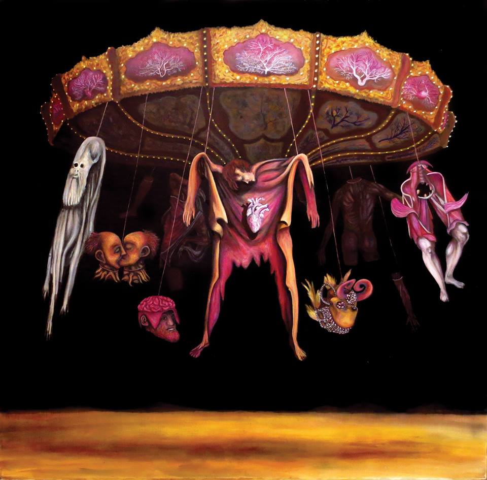 Son iconographie hybride des références à l’histoire naturelle, au mysticisme, au conte, aux imageries populaires et religieuses. Sa touche, sa palette et ses clins d’œil rappellent l’art des retablos mexicains (peintures ex-voto), qui, quelques décennies auparavant, a nourri la peinture de Frida Kahlo. Une source d’inspiration qui transparaît avec l’apparition d’éléments anatomiques autonomes dans l’espace de la toile, les corps blessés et un attrait pour une végétation dense et inquiétante. La figure humaine y est littéralement vidée et impuissante. Pendus aux manèges, les corps ouverts, écorchés, dépecés, laissent entrevoir leurs organes vitaux. Les artères et les veines s’articulent avec les racines, les branches et les insectes. Des êtres hybrides jaillissent. L’esprit de la culture mexicaine est également manifeste avec les portraits en pied d’un danseur, d’un clown et d’un arlequin. Ensemble, ils entament une procession, une danse grinçante et burlesque. Leurs visages cadavériques et leurs corps désarticulés font écho à celui des Calavaras, symboles populaires del Dia de los Muertos. Ici, la mort se rie de la vie. En ce sens, les peintures et les aquarelles de Maël Nozahic déploie une vanité incandescente et ténébreuse. La fureur et l’absurdité des chevauchées et des danses macabres traduisent un passage. Celui de l’éternel recommencement, de la fragilité et de l’éphémère fulgurance de nos existences.