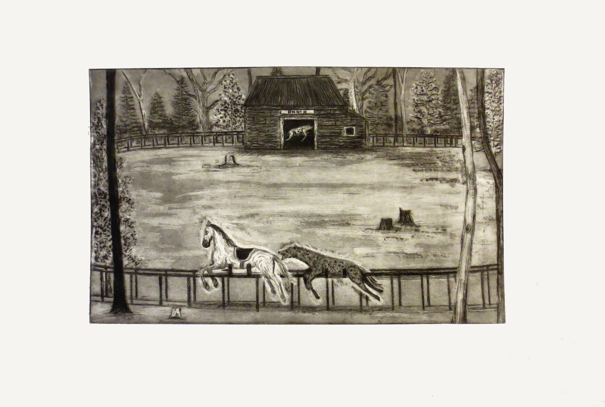 C’est derrière un grillage que Maël Nozahic découvre pour la première fois un parc d’attraction abandonné. Au cœur d’un bois est-allemand, les manèges de Spreepark sont immobiles, les décors artificiels ont basculé au sol. Par dessus leurs carcasses de bois et de résine, la nature reprend peu à peu ses droits. Les cris d’enfants ont fait place au silence et aux murmures de la forêt. Les guichets et les maisonnettes sont vidés, abîmés. Fascinée par les décors désincarnés, l’artiste photographie le paysage et décide de le transposer sur la toile pour le pénétrer et l’habiter. À l’inertie du réel, elle convoque un imaginaire où lyrisme et surréalisme dialoguent. Plongés dans la nuit et la forêt, les manèges sont réanimés par la présence d’animaux fantastiques : des hyènes, des loups, des chevaux, des singes et des griffons. Avec les chevaux de bois figés dans le temps et dans l’espace, ils entament une course folle contre la mort. À travers les ranchs, autour des manèges, ils forment un cercle et chevauchent une boucle infinie, survivante et absurde. Leurs corps en mouvement sont nimbés d’une lueur captivante, quasi chamanique. Leurs pelages sont teintés de couleurs électriques et irradiantes : bleu profond, rose électrique, gris métallique. La palette de l’artiste est chargée d’une projection à la fois symbolique et physique. Nous assistons au réveil nocturne d’un univers qui serait parallèle au nôtre. Entre rêve et cauchemar, entre réel et imaginaire, Maël Nozahic s’empare des décors abandonnés pour générer des scènes hallucinatoires où la figure humaine peine à trouver sa place.