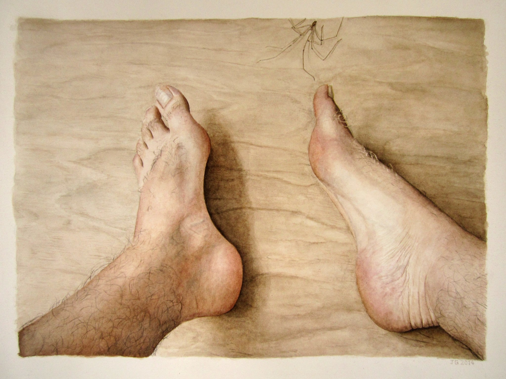 Julien Gorgeart déploie une dimension cinématographique dans sa peinture en récréant des scènes où chaque détail est repensé : les décors, les couleurs, les lumières, les postures, les expressions, les textures. Le quotidien est interprété par l’association d’images provenant de sources différentes : les photographies de l’artiste, des images récoltées sur Internet ou encore des photogrammes de films. Les œuvres sont les résultats d’une adéquation de réels fragmentés et recomposés. Nue sous la douche, une jeune femme nous dévisage d’un regard blasé ; une voiture couverte d’un drap blanc erre à l’entrée d’une palmeraie ; des serviettes de bains sèchent dans le désordre d’une arrière cour ; une araignée aux longues pattes s’approche de pieds nus ; un homme ivre et joyeux trinque allongé sur le sol. Chaque scène peut être comprise comme une amorce narrative, un espace de projection où une histoire est en train de se jouer. L’imaginaire et le réel fusionnent pour donner naissance à un univers où la sensation du réel est insufflée. Le traitement des images et les choix chromatiques génèrent une ambivalence où cohabitent le drame et l’insouciance. Les figures humaines y sont vulnérables. Une main nous présente le Polaroid d’une femme aux seins dénudés : est-elle morte ? Qui la recherche ? Est-ce le souvenir d’une histoire passée ? Présente ? Parce que les ingrédients du mystère et du suspens sont mis à l’œuvre, tous les scénarios semblent possibles. En retenant des fragments de son expérience personnelle, de son histoire, Julien Gorgeart déroule lentement, avec le temps de la peinture, les images de sa propre histoire, de son propre film dont il sélectionne et reconstitue chaque détail. Les natures mortes côtoient des scènes marquées à la fois par une joie de vivre et une désinvolture, mais aussi par des caractéristiques énigmatiques et insaisissables. En combinant les histoires, les époques et les géographies, l’artiste produit une peinture où le quotidien est théâtralisé. Il explore une zone ténue où la réalité est finalement augmentée.