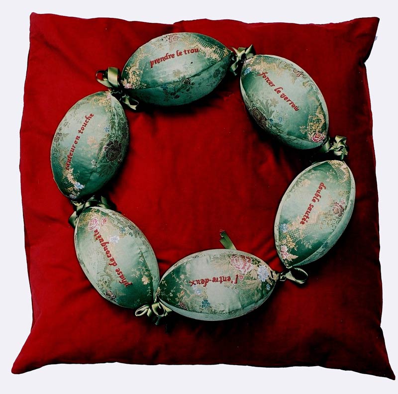 Le bijou de la reine, 2007, 6 ballons de rugby, tissu XVIIIe siècle– soierie lyonnaise, expressions de l’univers du rugby réalisées en broderies en relief – 110 cm x 110 cm x 16 cm (épaisseur),présenté à l’exposition XV – musée Géo-Charles, Echirolles, Isère.