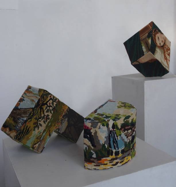 Dominique Torrente a procédé à un travail de recherche et de récolte de différents canevas pour les découper, les déstructurer et les conjuguer avec un langage nouveau. Les fragments de tissus colorés sont en effet combinés à des volumes aux contours géométriques et minimalistes. Ces formes, qui appartiennent à la grammaire de l’art actuel, nous replongent dans l’histoire de la sculpture moderne et contemporaine. Brancusi, Sol LeWitt, Artschwager, Nemours, Raetz, Arp, Cragg, Morellet et bien d’autres artistes ont nourri et continuent de nourrir un répertoire de formes estampillées « art contemporain ». Un travail sur les socles a engendré deux dispositifs de monstration. Soit, les volumes sont intégrés à des socles aux formes découpées et aux couleurs acidulées ; soit, ils sont disposés sur des guéridons, des tabourets ou des tablettes en bois. L’artiste allie ainsi le socle « art contemporain » (le musée, la galerie, le centre d’art) avec le socle domestique (le foyer, le quotidien et l’intime). En les recouvrant les volumes de patchworks de canevas, Dominique Torrente hybride deux mondes qui ne se comprennent pas. Les formes considérées comme étant nobles sont colonisées par les fibres d’une pratique considérée comme étant kitsch et ringarde. Pourtant, le regardeur, peu importe son milieu social, ne se retrouve pas systématiquement dans l’art actuel. L’artiste souhaite alors distiller des repères attachés à une histoire, un patrimoine et une mémoire partagée.