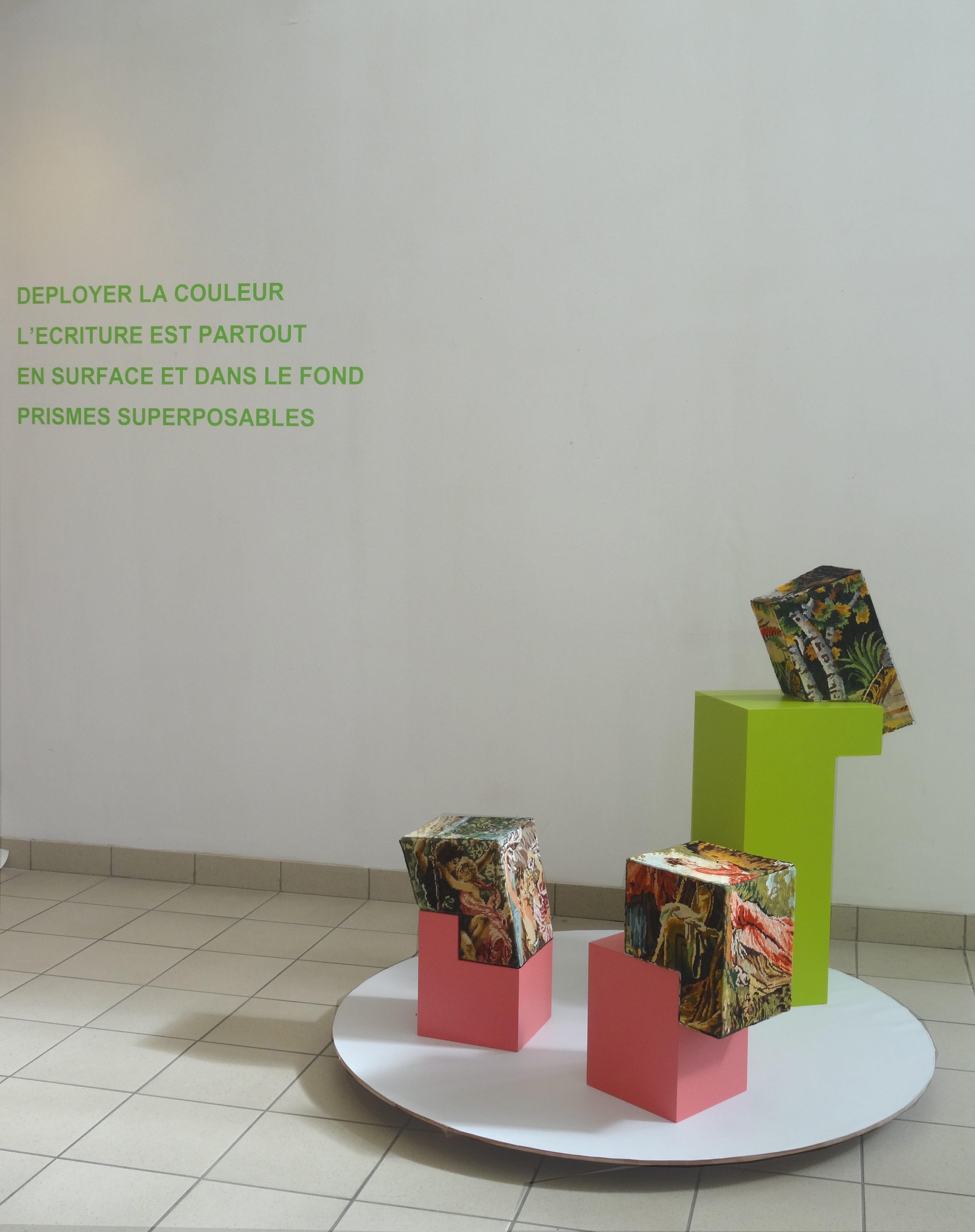 Série Hybrid lexis, « prismes », à l’arrière plan « Transfert », Divers matériaux, dont canevas, 2014.