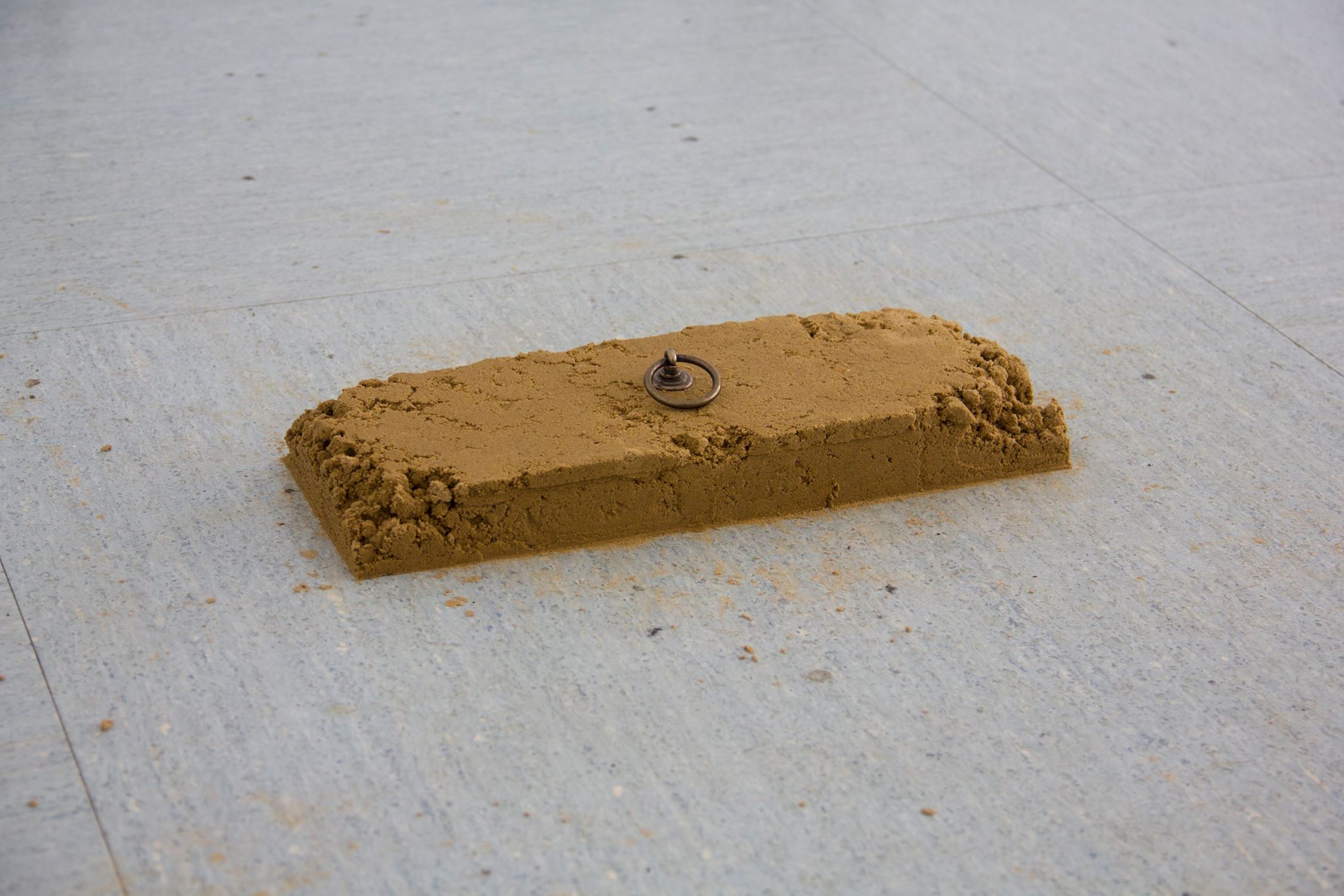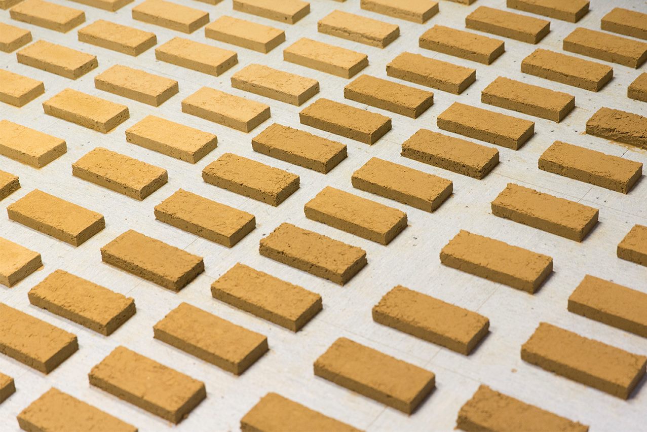 D’une autre manière, l’artiste fixe au mur une longue bande de terre qui semble comme suspendue dans l’espace (Line – 2014). Au fil des heures et des minutes, la matière s’égraine et se dépose sur les plinthes de l’atelier. Un peu plus loin, une série de bâtons est disposée de manière oblique entre le sol et le mur. Les œuvres sont les prémices d’architectures en devenir ou bien les résidus d’édifices évanouis. Sa pratique fait écho au minimalisme, au Land art et à la performance, les trois courants artistiques sont digérés et hybridés au profit d’un travail de sculpture spatial, corporel et éphémère. Du Land Art, elle conserve une exigence matérielle : faire avec son environnement direct, sans ajout. La manipulation du matériau unique génère une série de formes et d’objets aux contours épurés. Son œuvre comporte une dimension performative puisqu’elle met en place un dispositif non seulement lié au chantier (une somme de gestes répétés : prendre la terre, la ramener, la mélanger, la tamiser, la malaxer, la mettre en forme), mais aussi à l’espace et aux limites de son propre corps. Les œuvres éphémères résultent d’une constante interaction entre le matériau, le corps et l’espace. Sans artifice et au moyen de gestuelles précises, la terre est manipulée pour faire corps avec l’espace.