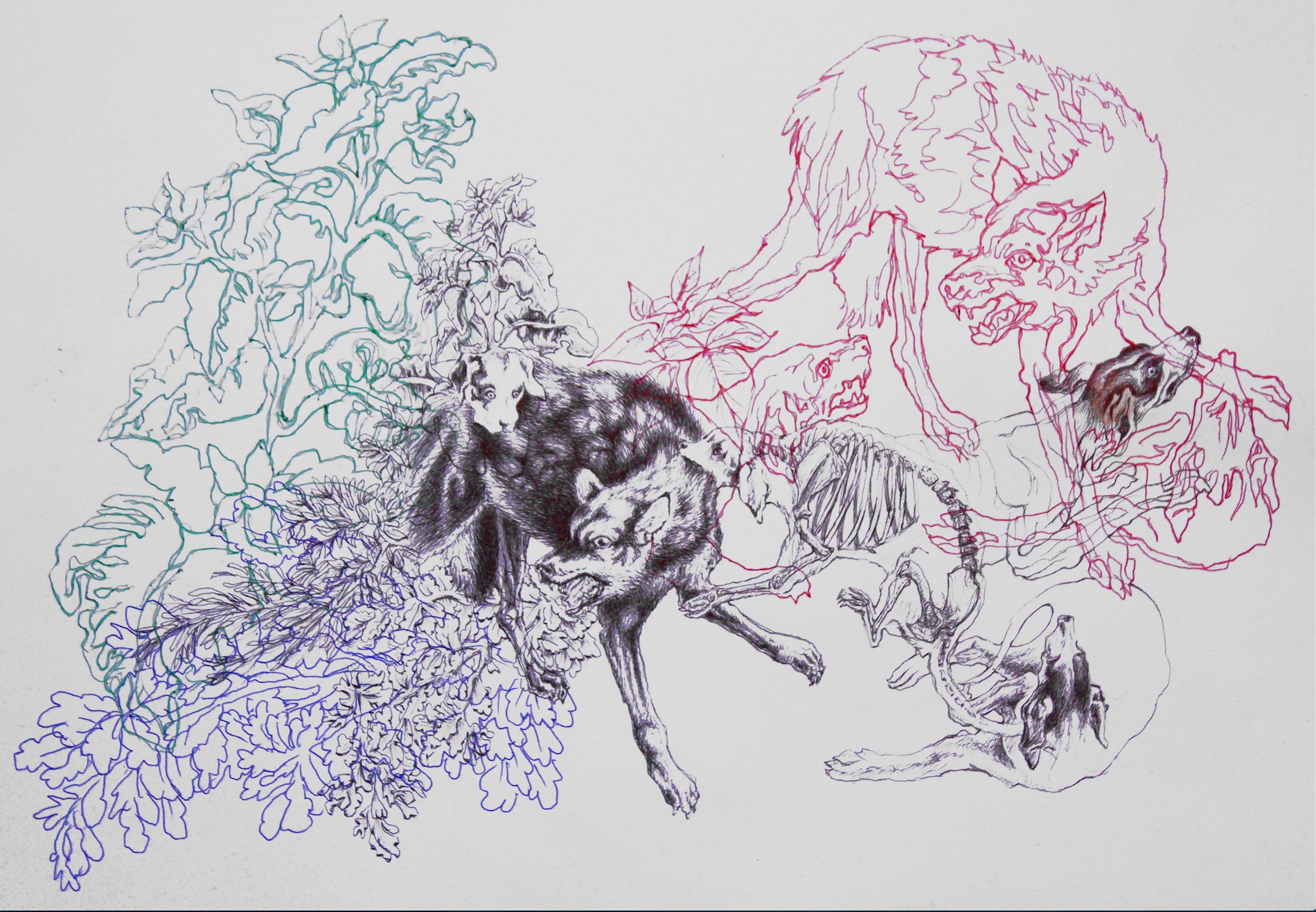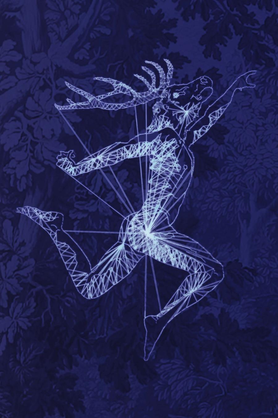 Les créatures animales de Julien Salaud investissent les salles du rez-de-chaussée du Musée de la Chasse. Au cœur des deux premiers espaces, l’artiste engage un dialogue avec un ensemble de tapisseries de la tenture des Chasses Nouvelles (1686-1755) réalisées par la manufacture royale de Beauvais en 1728. Les œuvres ont été tissées d’après les modèles peints par Jean-Baptiste Oudry (1686-1755). Ainsi les quatre murs de la première salle d’exposition sont recouverts de la Chasse au Renard, la Chasse du Loup, la Chasse au Sanglier et la Chasse au Cerf. Au centre trône un cerf dont le pelage est colonisé par de minuscules perles de rocaille brunes et brillantes (Printemps – Nymphe de Cerf / 2013-2015). Les bois de l’animal sont prolongés par des branchages naturels eux aussi enveloppés de perles. Il se dresse sur un monticule de peaux assemblées entre elles. L’animal semble à la fois s’extraire des peaux, mais aussi des tapisseries qui l’entourent. Le cerf, présenté en majesté, n’est pas une proie que l’homme menace. Bien au contraire, c’est l’animal qui domine l’homme de sa présence et de son aura énigmatiques. Dans la seconde salle, dans une tapisserie intitulée La Chasse au Vol, des chasseurs s’adonnent à la fauconnerie – une scène que Julien Salaud associe à une créature double formée à la fois d’un sanglier et d’un faisan (Faisanglier – 2015). Le corps du sanglier est ainsi harnaché de longues plumes, il est surmonté du volatile dont le corps semble se fondre dans le sien. La question du savoir-faire, de la technique et du lien avec l’artisanat, relie les tapisseries de Beauvais avec la pratique artistique de Julien Salaud qui travaille seul la taxidermie, le perlage, le filage et les autres ajouts manuels. Plus loin, il nous faut nous approcher d’une tapisserie de peaux dont le centre ouvre sur une autre pièce. À travers l’ouverture, nous observons une scène de chasse mythologique dessinée au moyen de fils tendus dans l’espace. L’œuvre est plongée dans le noir, les fils blancs sont rendus visibles grâce à de la lumière noire. Le dessin irradiant de bleu réclame ainsi une adaptation rétinienne afin de saisir toute la scène. L’exposition se termine par la présentation du film Emergence Arachnéenne où le corps nu de l’artiste est pris dans une toile hors norme. Elle forme un cocon qui l’empêche de se mouvoir, de voir et de respirer. Il est à la fois l’araignée et l’insecte victime de la toile. Julien Salaud puise dans des registres fantastiques et mythologiques pour nous livrer une réflexion sur la figure animale : l’histoire de sa représentation, sa symbolique, mais aussi son devenir et sa disparition. En entremêlant les espèces et les interventions manuelles, il questionne les relations complexes entre l’humain et l’animal.