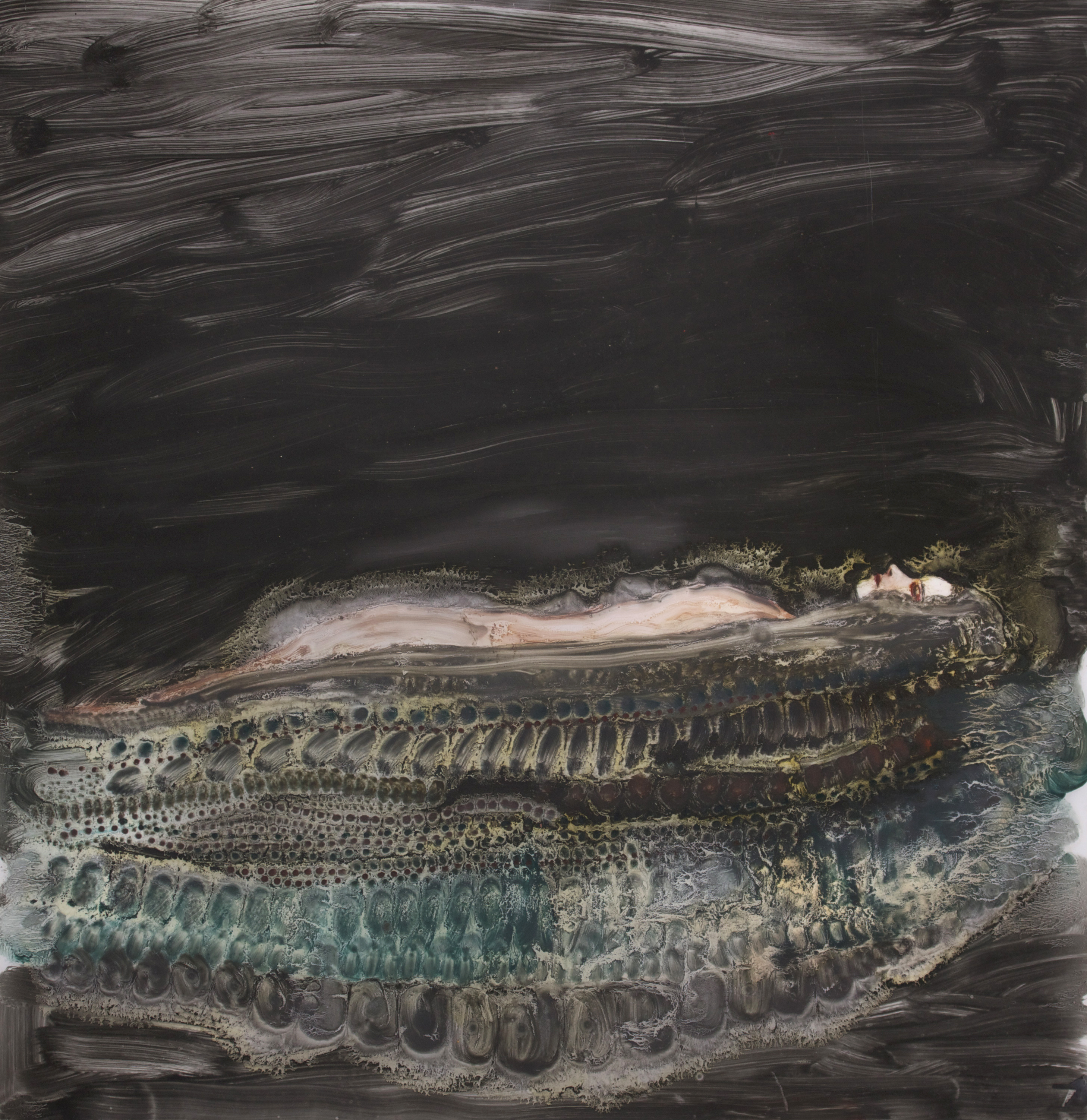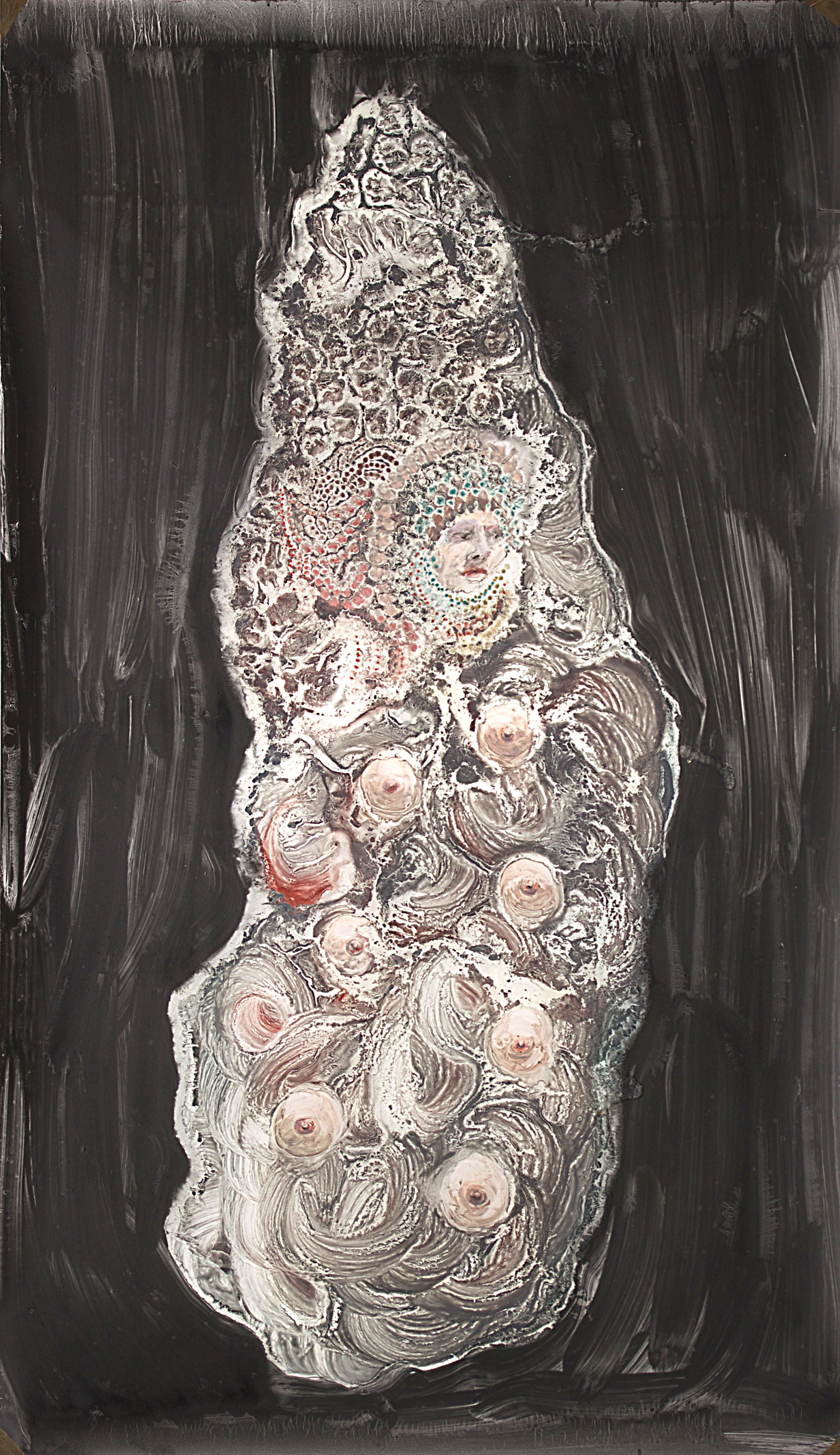 Un rapport dichotomique que Sarah Jérôme distille dans son œuvre en opérant à des frottements entre la séduction et la répulsion, l’étonnement et l’effroi, le rêve et le cauchemar, la délicatesse et la brutalité. Elle explore un espace entre-deux, deux états, deux sentiments, deux moments. Mue, réalisée en 2013 figure un couple dont les corps sont enchevêtrés. Formés de longs fils de lins tressés, ils semblent surgir de la matière, comme l’apparition d’une vision, d’un souvenir aussi bienveillant qu’angoissant. Les tresses épaisses les emprisonnent, ils sont comme pétrifiés, figés dans le temps. L’artiste fait ici référence à nos ancêtres dont les histoires nourrissent non seulement les nôtres, mais aussi une mémoire collective. Entre présence et absence, ils nous habitent et traversent le temps. Leur apparence fascinante et monstrueuse souligne la complexité de l’histoire humaine. L’artiste fouille la dimension monstrueuse du corps avec une série de peintures intitulée Les Montagnes. Sur des feuilles de calque, la peinture à l’huile est asséchée par l’essence. Les matières opposées sont travaillées par le dessin. L’artiste prélève et creuse la peinture pour faire surgir des visages féminins de montagnes massives et monumentales.