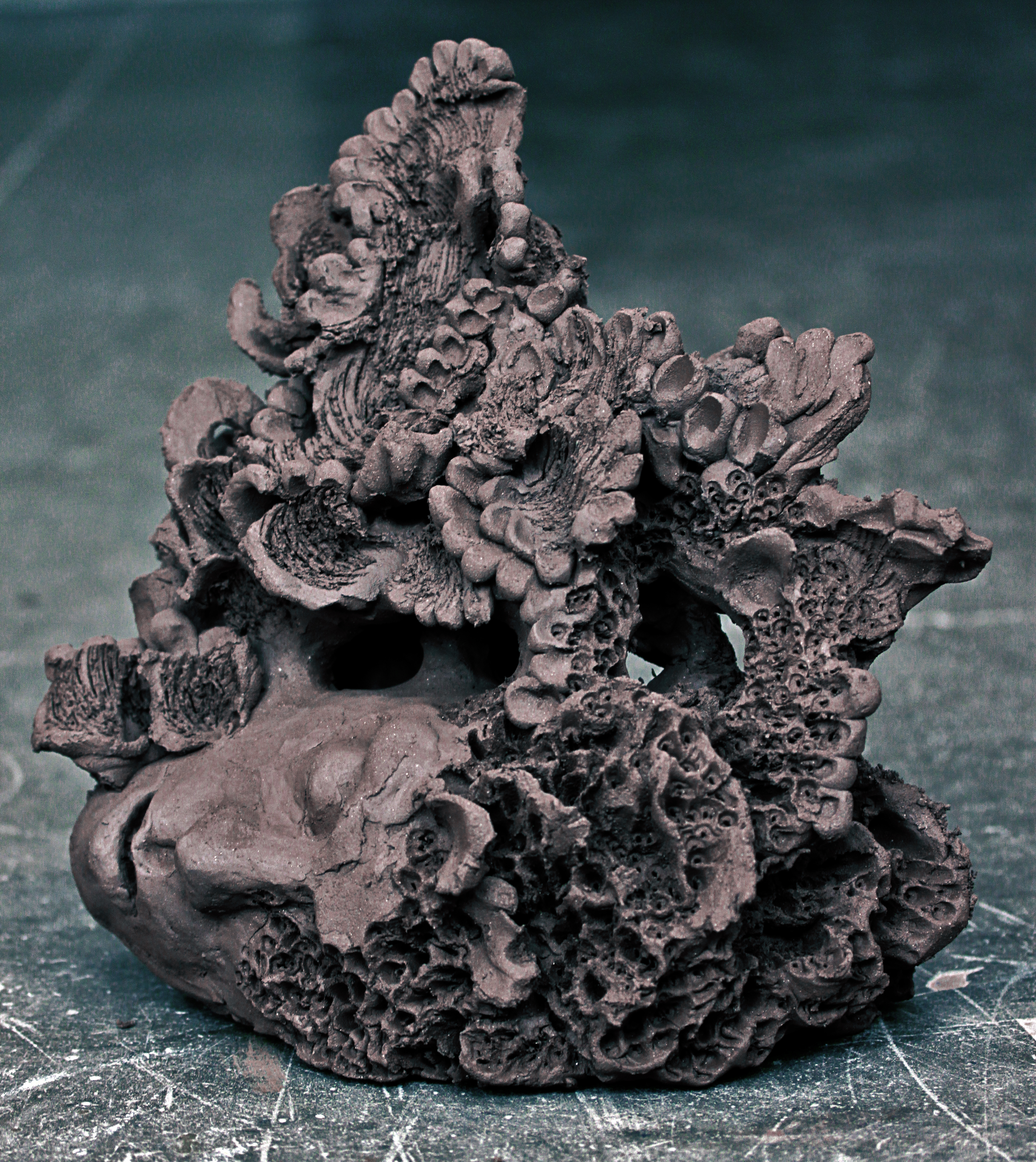 Telles des chrysalides rocheuses renfermant des corps de femmes, les montagnes sont autant un abri à l’intérieur duquel il est possible de se cacher, qu’une prison. Les corps sont ici envisagés comme des constructions formées de couches et de strates. Pris dans la matière et dans l’ambivalence, ils sont en devenir ou bien murés dans la douleur et l’impossibilité. Il en est de même pour les visages sculptés dans la terre. Le Champs de Pensées est composé de têtes endormies disposées au sol, elles sont survolées par un groupe de cordeaux dont les intentions sont aussi menaçantes que protectrices. En hybridant le corps, la nature et la mémoire, Sarah Jérôme revisite un registre symboliste convoquant la magie, la religion, les mythologies et la poésie. Son œuvre engendre une vision plurielle de notre histoire, des relations humaines et de nos relations à la nature. Entre épanouissement et aliénation, l’artiste sonde la matière humaine pour en extraire les trésors monstrueux.