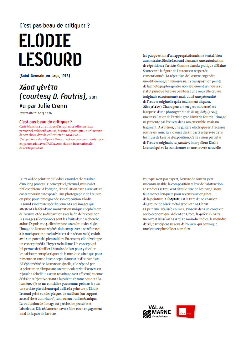 Χάοσ γένέτο – 2011 / (courtesy D.Foutris) Acrylique sur MDF – 105 x 70 cm Inventaire n°2013 21 26 / Photo / Claude Gaspari Collection du MAC/VAL