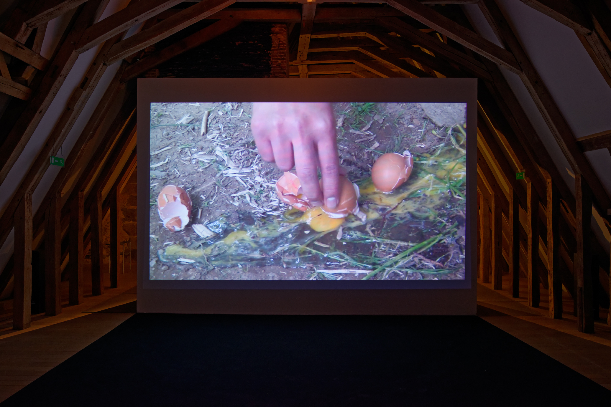 Laure Prouvost, Wantee, 2013, techniques mixtes, vidéo (14 min). Vue de l’installation MDAC Rochechouart. Courtesy de l’artiste et de Mot International (Londres, Bruxelles). Photo Aurélien Mole