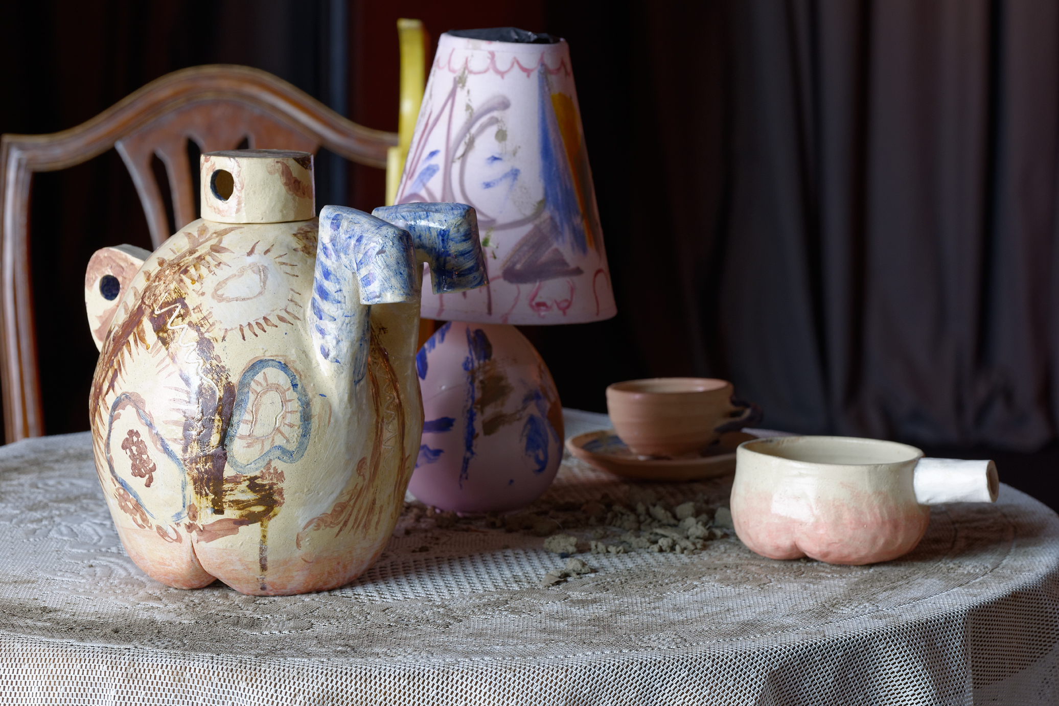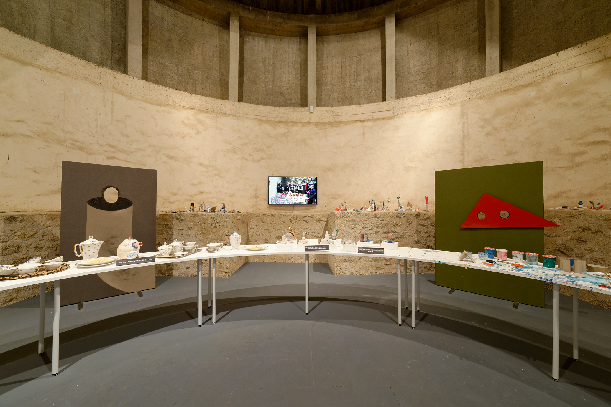 Laure Prouvost, Grandad’s Visitor Center, 2014, avec Maquette For Grand Dad’s Visitor Center , Become a Triangle and Become a Tunnel, table, desserte, service à thé, paper-board, projets de maquette. Courtesy de l’artiste, de MOT international (Londres, Bruxelles) et de la galerie Nathalie Obadia (Paris, Bruxelles). Vue de l’exposition MDAC Rochechouart. Photo Aurélien Mole