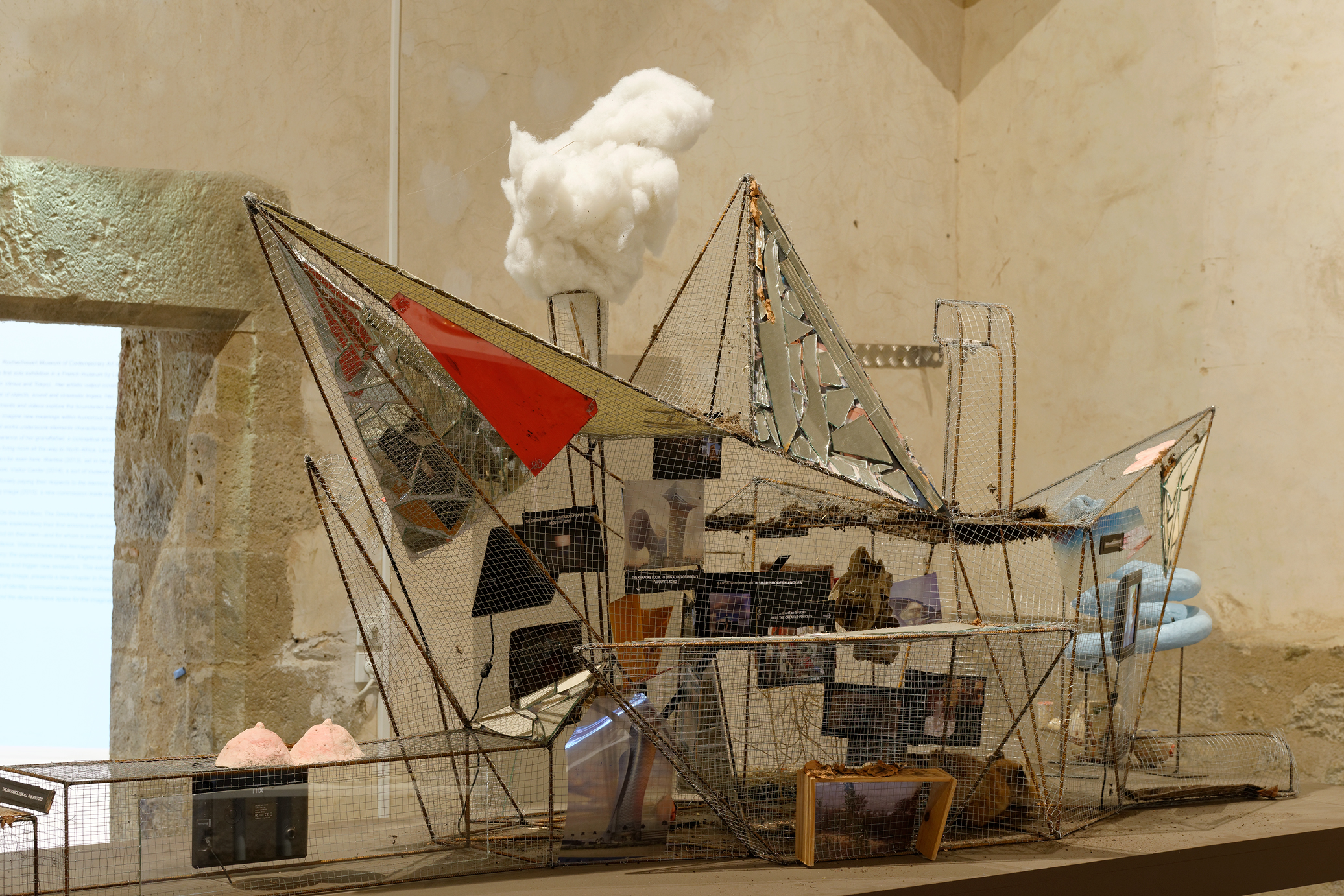 Dans la tour du château, nous découvrons le Grandad’s Visitor Center, une œuvre interactive et participative. L’artiste active le projet de construire un musée dédié à l’œuvre de son grand-père dont la maquette est présentée à l’entrée. Celle-ci est réalisée à partir de grillage à poule, de tablettes vidéo, de tasses de thé, de boue et de sculptures miniatures. Tous ces éléments sont entremêlés au sein d’une architecture dotée d’une silhouette moderniste. En face est installée une table en arc de cercle. D’un côté, du thé et des petits gâteaux sont offerts aux visiteurs. Le film d’une performance réalisée en 2013, nous informe qu’une levée de fonds a été initiée par ses petites-filles. La vente des gâteaux devait permettre le retour de leur grand-père perdu entre l’Europe à l’Afrique : « Sil vous plait, aidez-nous à retrouver grand-père. » De l’autre côté, du matériel est mis à disposition du visiteur pour réaliser des sculptures miniatures. Toutes les sculptures sont réunies et présentées au même titre que celles de l’artiste. La hiérarchie entre l’art et le non-art est alors évacuée. Aux murs, des affiches sont renouvelées quotidiennement : « Pourquoi grand-père doit revenir sur terre et sortir de son tunnel ? » Les réponses, directement inscrites sur les affiches, attestent de l’imagination ou de la suspicion des visiteurs.