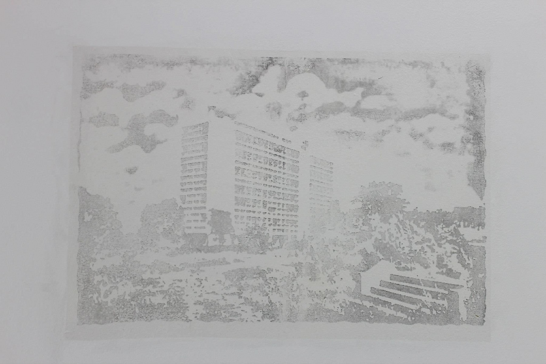 La ville, ses paysages, son architecture et ses temporalités, constituent le cœur de la réflexion artistique d’Ibai Hernandorena. Ce dernier s’intéresse plus particulièrement à la notion de modernité, aux utopies qu’elle engendre et à leur évanouissement à travers les époques. Des utopies, qui, au fil des décennies, s’effondrent, évoluent ou se renouvellent. Ainsi, il réalise Promesse (2014), un château de cartes monumental formé à partir d’éléments de façade dessinés par Jean Prouvé. La sculpture semble à la fois lourde et fragile. Entre construction et déconstruction, l’idée de modernité ne tient plus qu’à un fil, elle peut vaciller à chaque instant. En ce sens, l’artiste travaille les fantômes des villes et des bâtiments. Ainsi, il articule des modules en acier, qui forment un Paysage (2015) qui mue et s’adapte à l’espace d’exposition. Celui d’une vue architecturale dont il a sobrement extrait le dessin. De même, la photographie intitulée Glissement présente un bâtiment en cours de destruction. L’immeuble, dont il ne reste plus que le squelette, semble être celui d’une maquette en carton, fragile et éphémère. L’image est troublée, les couleurs sont accentuées et décalées. Notre vision est alors perturbée, l’image du bâtiment en voie de disparition se fait persistante. En Espagne, Ibai Hernandorena filme une ville fantôme, Seseña, au sud du Madrid (Falls – 2015). Après la crise immobilière de 2008, la ville demeure en chantier, elle est à peine habitée, à peine activée. À bord de sa voiture, il filme autour d’un rond-point, l’image est exagérément ralentie. Le travelling semble infini. Le paysage est rendu flou, insaisissable, évanescent. Une sensation que nous retrouvons dans la série Destinations (2015), où, sur des feuilles de papier, l’artiste a transposé par la brûlure des cartes postales où figurent les Grands Ensembles construits entre les années 1950 et 1970. Les signes de la modernité, et par extension d’une utopie collective, s’évanouissent lentement. Malgré leur lente calcination, le voyage des cartes postales est prolongé d’une manière précaire.