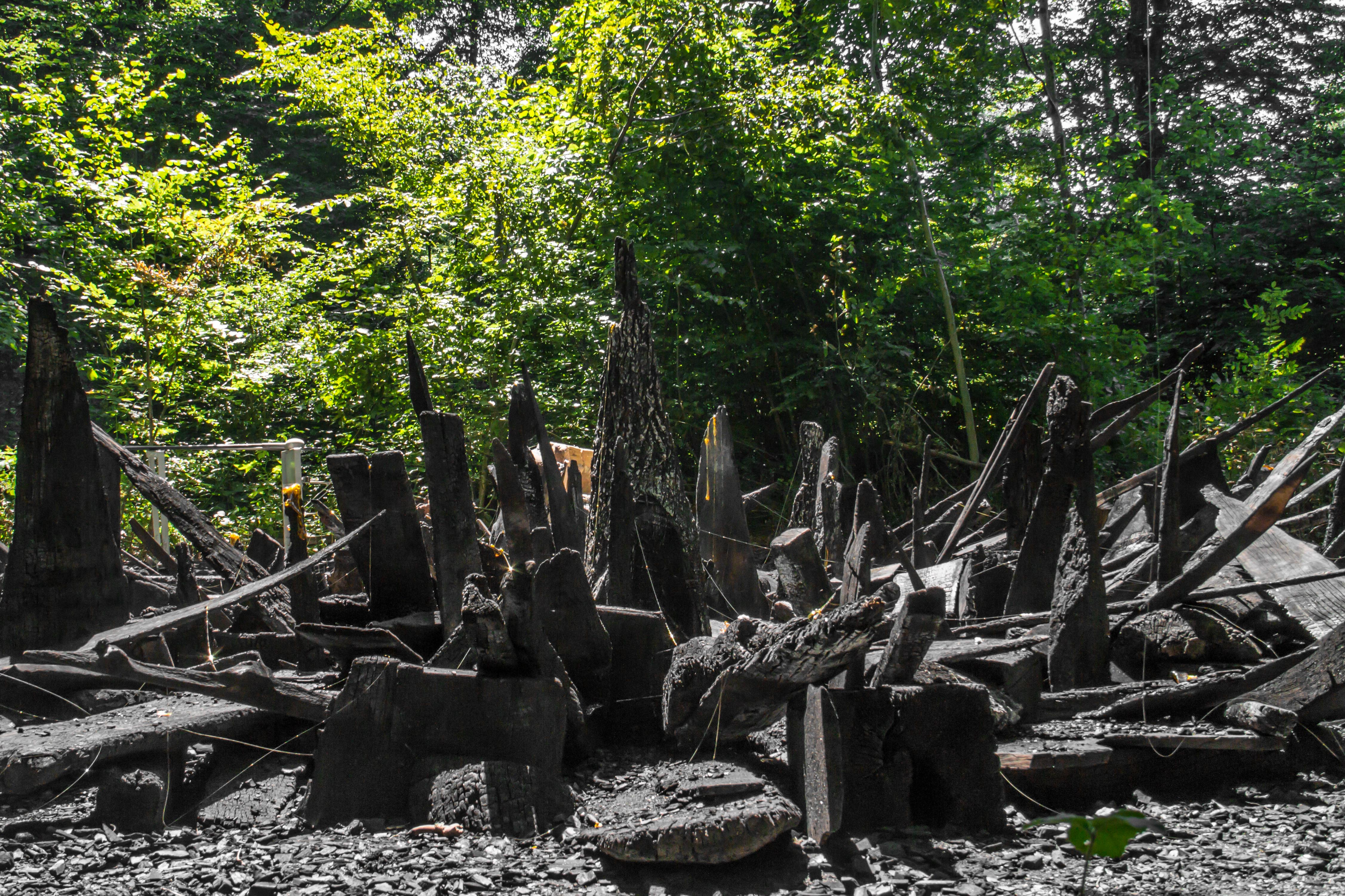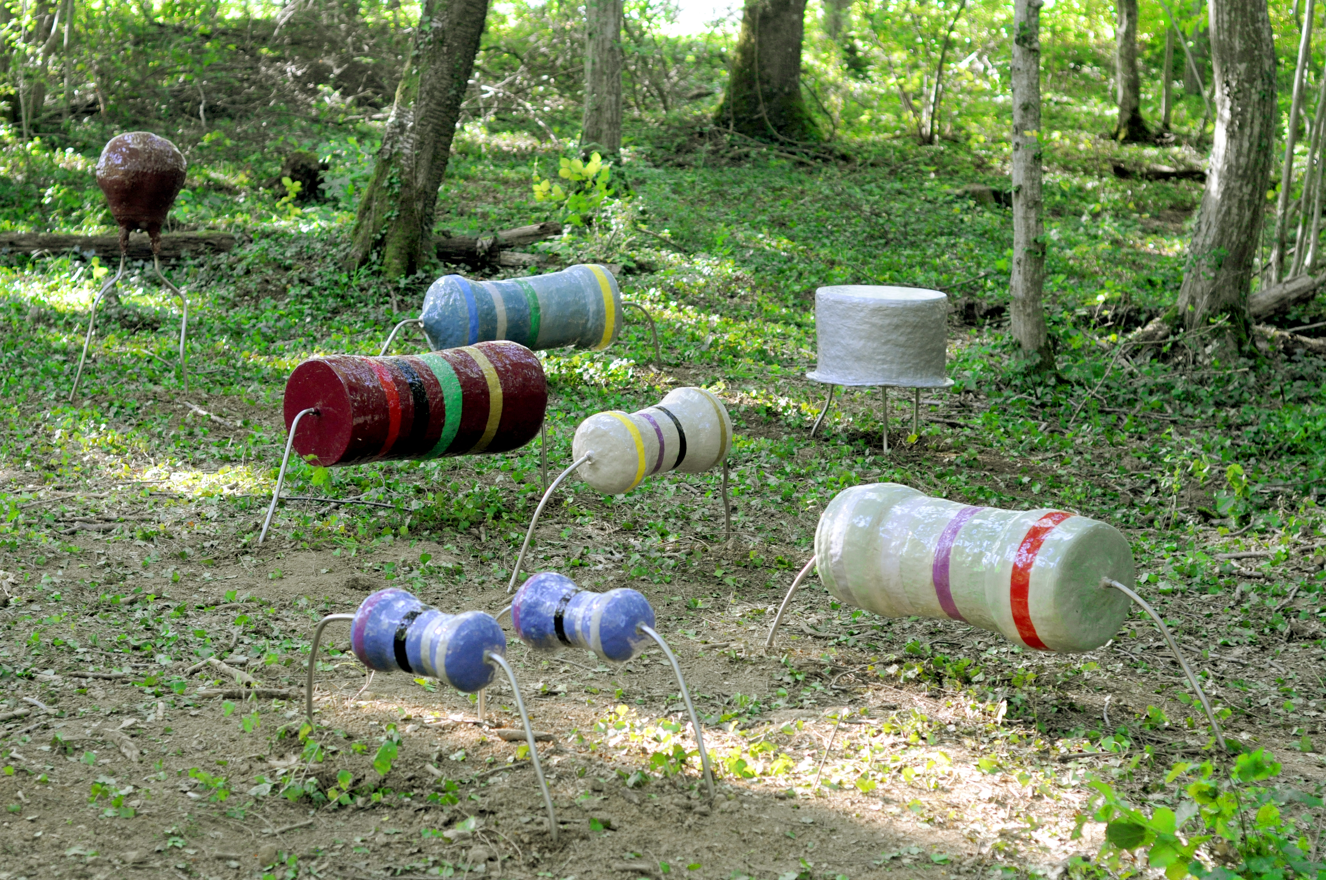 Au fil des marches en compagnie de Pascal Yonet (le directeur du Vent des Forêts), j’ai découvert des œuvres plurielles, figuratives ou abstraites. Le lien avec la nature n’est pas une donnée prépondérante, les propositions sont dans l’ensemble inédites et surprenantes. À l’exemple de la baguette magique de Jean-Luc Verna, plantée dans la terre et se dressant majestueusement entre les sapins. Lilith, un totem percutant de Damien Deroubaix, qui, sur un tronc d’arbre peint en noir et gravé a dressé le buste d’une femme polymaste aux yeux bandés. Sur ce qui fut une ancienne décharge publique, Marteen Vanden Eynde a déposé une boule géante composée d’une multitude d’objets ayant appartenu aux habitants des différents villages. Yuhsin U Chang fait surgir du sol une colonne de fumée réalisée à partir de laine de mouton. Fujiko Nakaya crée un jardin japonais traversé de brumes d’eau. À découvrir également, une installation anarchique de Sandrine Pelletier et Olivier Ducret où le bois calciné et le verre sont combinés, les bunkers-ruches de Nicolas Floc’h, le cerf-volant de Jennifer Caubet, les composants électroniques géants de Bevis Martin et Charlie Youle, les souches augmentées de têtes animales de Lionel Sabatté, les bols militants d’Ehren Tool ou encore la mise à jour de milliers de racines par Douglas White. Lors de mon court séjour, j’ai aussi rencontré Vincent Ganivet qui, depuis deux ans, met au point un four permettant la fonte d’aluminium. Au Vent des Forêts, il peut mettre à profit ses recherches pour produire des cloches en aluminium qui seront par la suite disposées dans la forêt. Toutes les expérimentations sont permises. L’alchimie s’opère entre les univers de chacun des artistes invités, le cadre naturel et les habitants. La synergie de leurs envies, de leurs projets et de leurs attentes donne au Vent des Forets un visage profondément humain et engagé. À l’heure où les modèles de production, d’exposition et de diffusion de l’art sont à repenser, le Vent des Forêts fait le pari de l’expérimentation, la mutualisation, du dialogue, de la proximité et de la sincérité.
