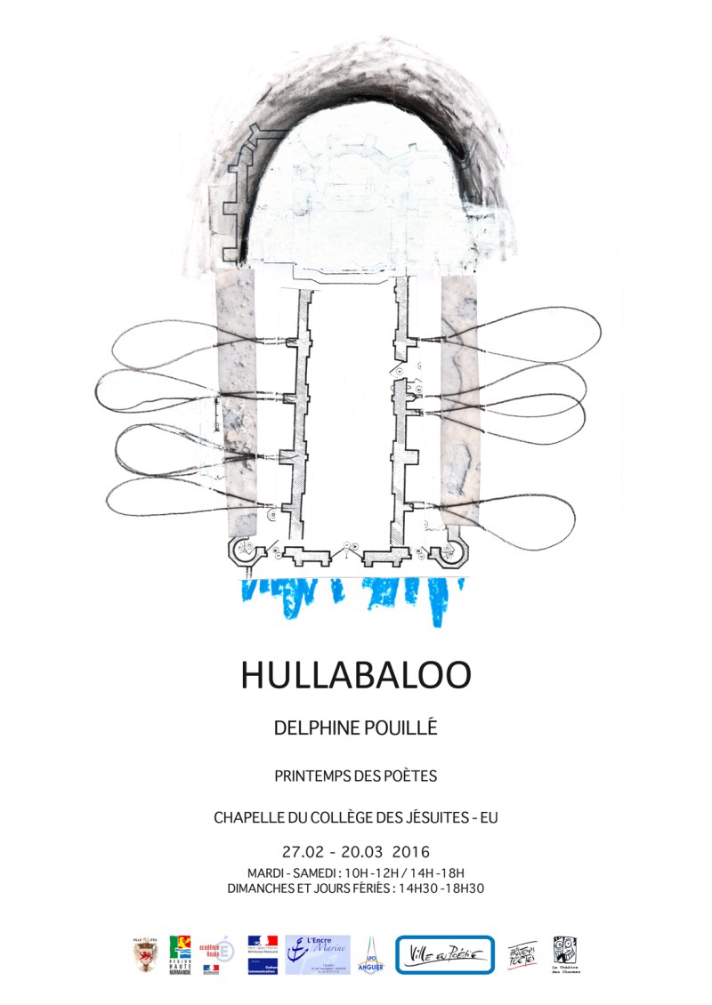 Hullabaloo est un terme populaire anglophone qui signifie ramdam, raffut ou bazar. Au sein d’une architecture à dominante baroque? Delphine Pouillé installe un corps étranger au centre de la chapelle. Dans le labyrinthe nous trouverons la voie droite. À la pierre sculptée, solide, pérenne et normée, l’artiste répond par l’instabilité de la mousse de polyuréthane. Le corps est doté d’une membrane de tissu sous laquelle la mousse expansive est injectée. Il provient des airs, se dépose goulûment sur son ventre froid, un ballon de plage tricolore de deux mètres de diamètre. Posé sur le dallage noir et blanc, il rappelle non seulement l’ornementation théâtrale, la volupté des formes baroques, mais aussi les couleurs présentes dans les vitraux. D’autres corps sont installés dans le chœur de la chapelle. Nous assistons ainsi à une étrange colonisation de l’espace.