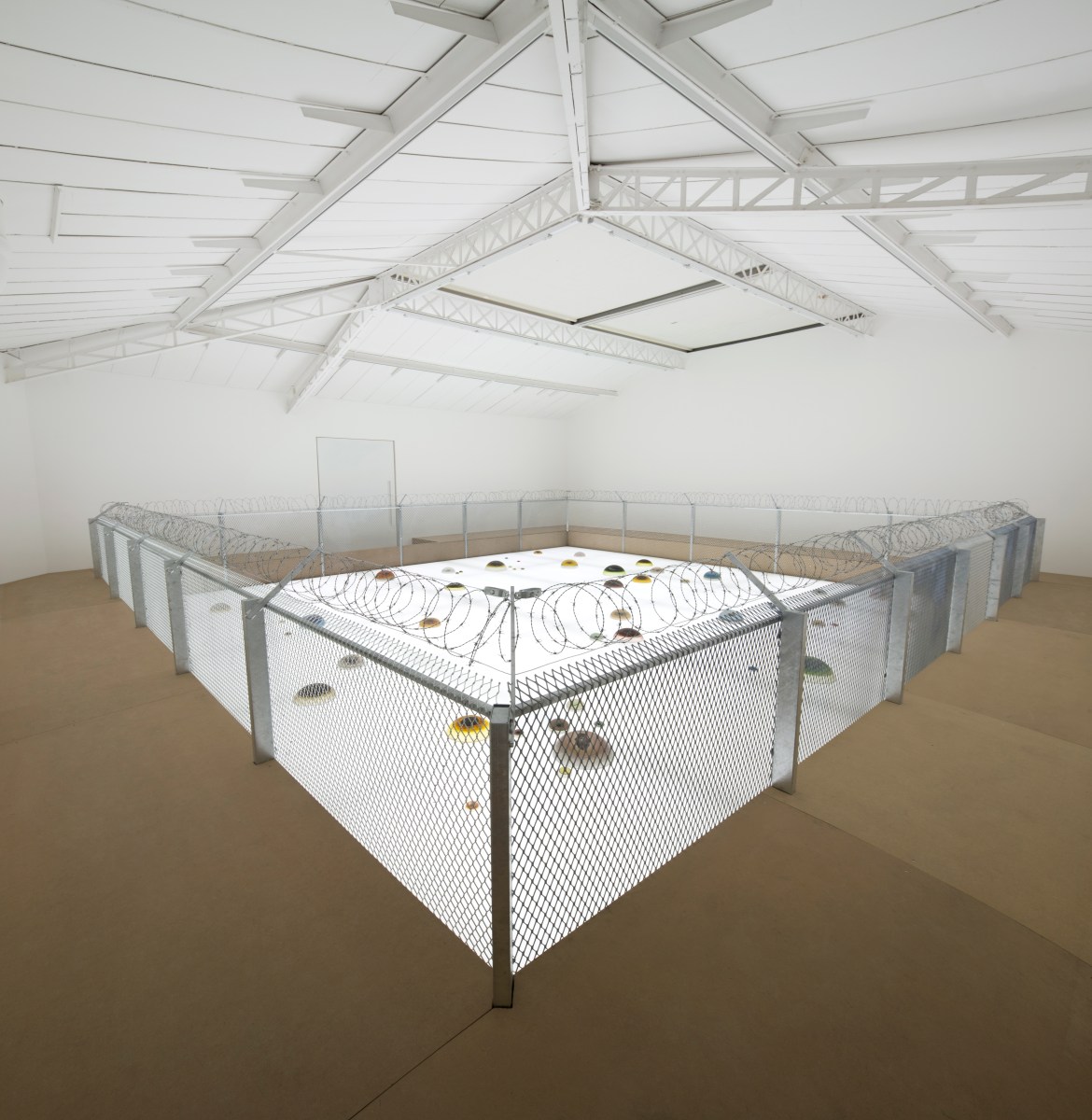 Installation: caisson lumineux, résine, fil de fer barbelé / light boxes, resin, barbed wires